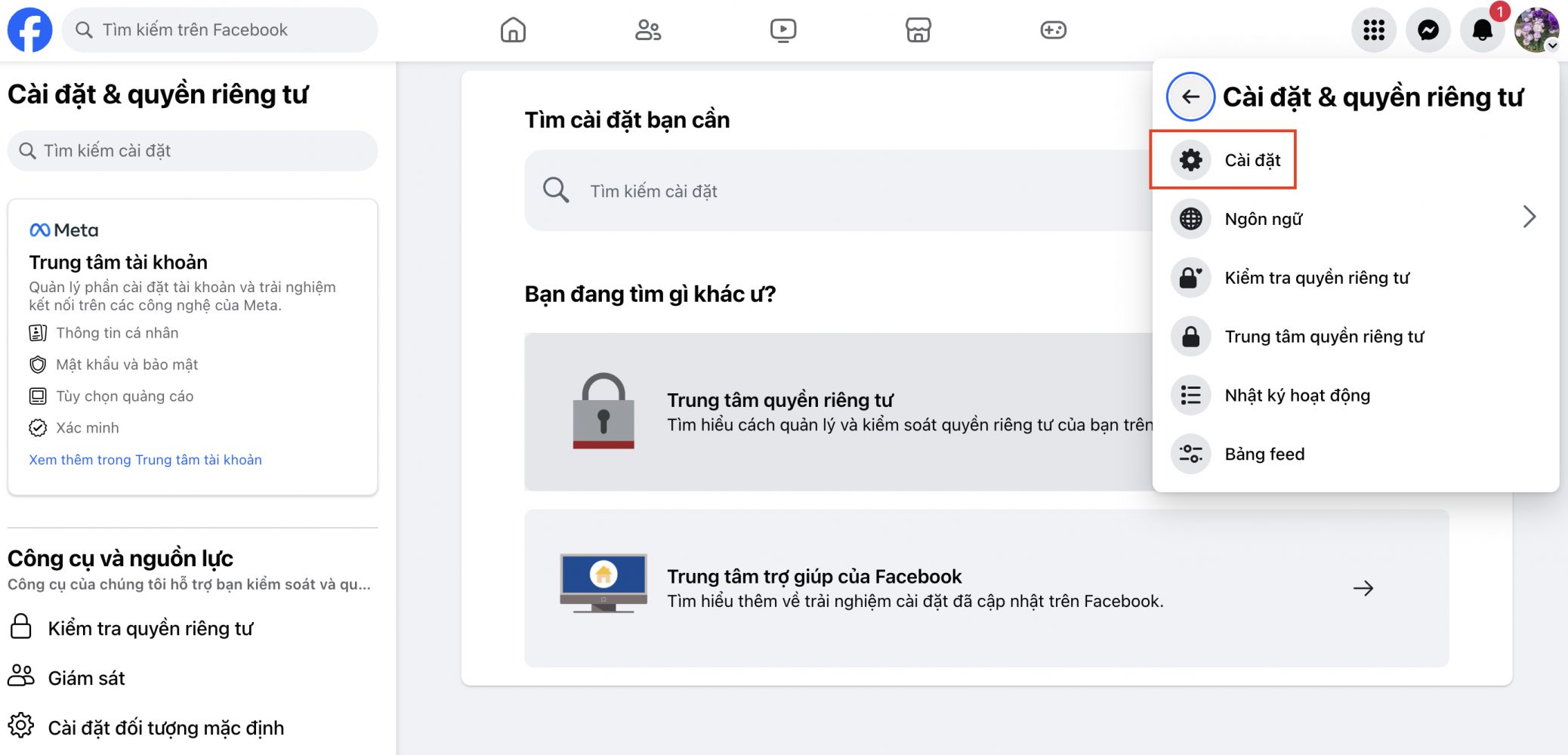 • Đăng nhập vào tài khoản Facebook, bạn click chuột ở góc phải trên cùng và chọn mục “cài đặt và quyền riêng tư”, sau đó chọn tiếp mục “cài đặt”.