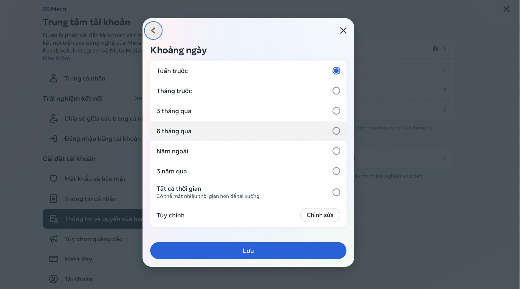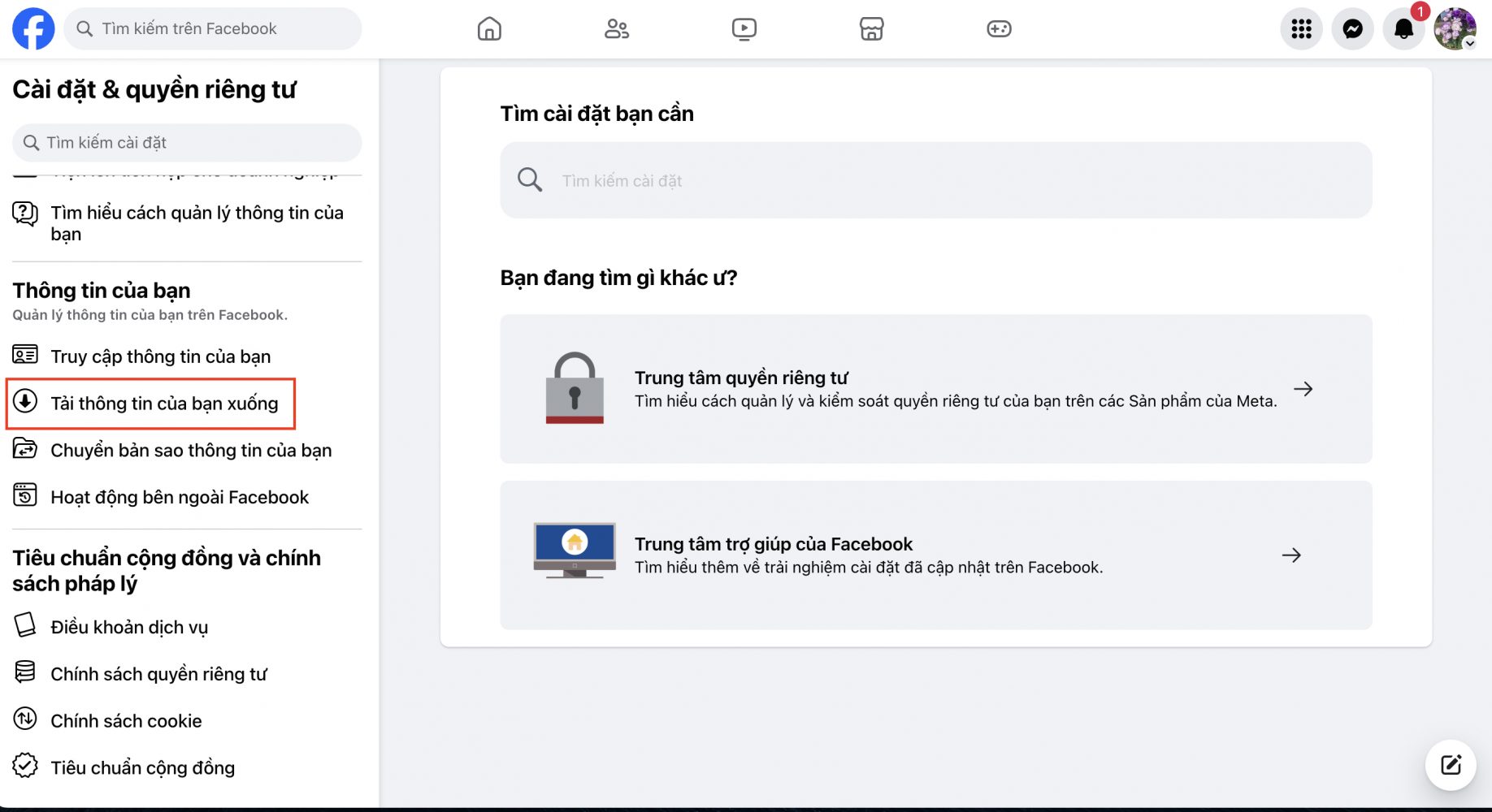 • Bạn chọn vào mục “thông tin của bạn trên Facebook” và chọn “tải thông tin của bạn xuống”.