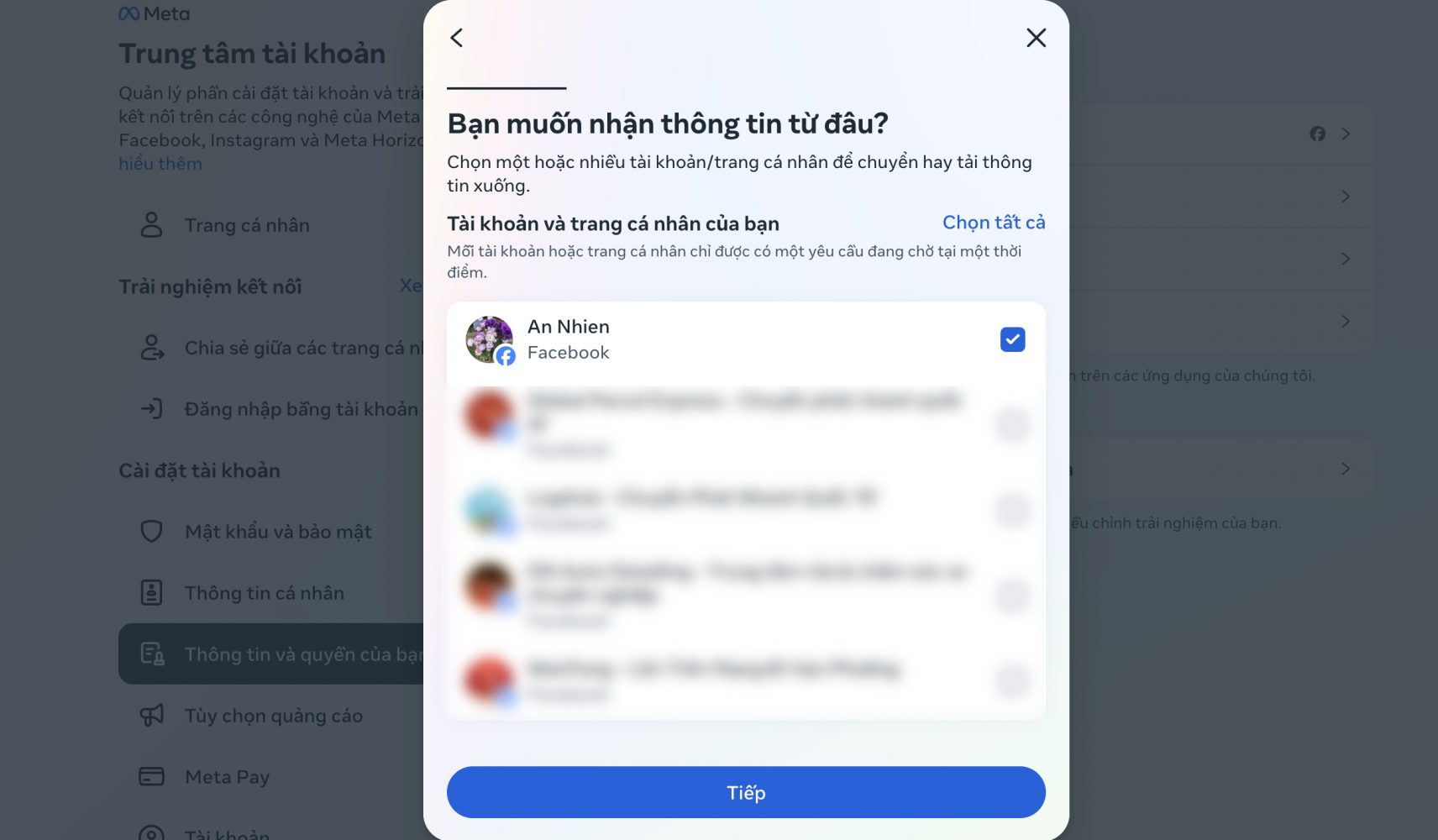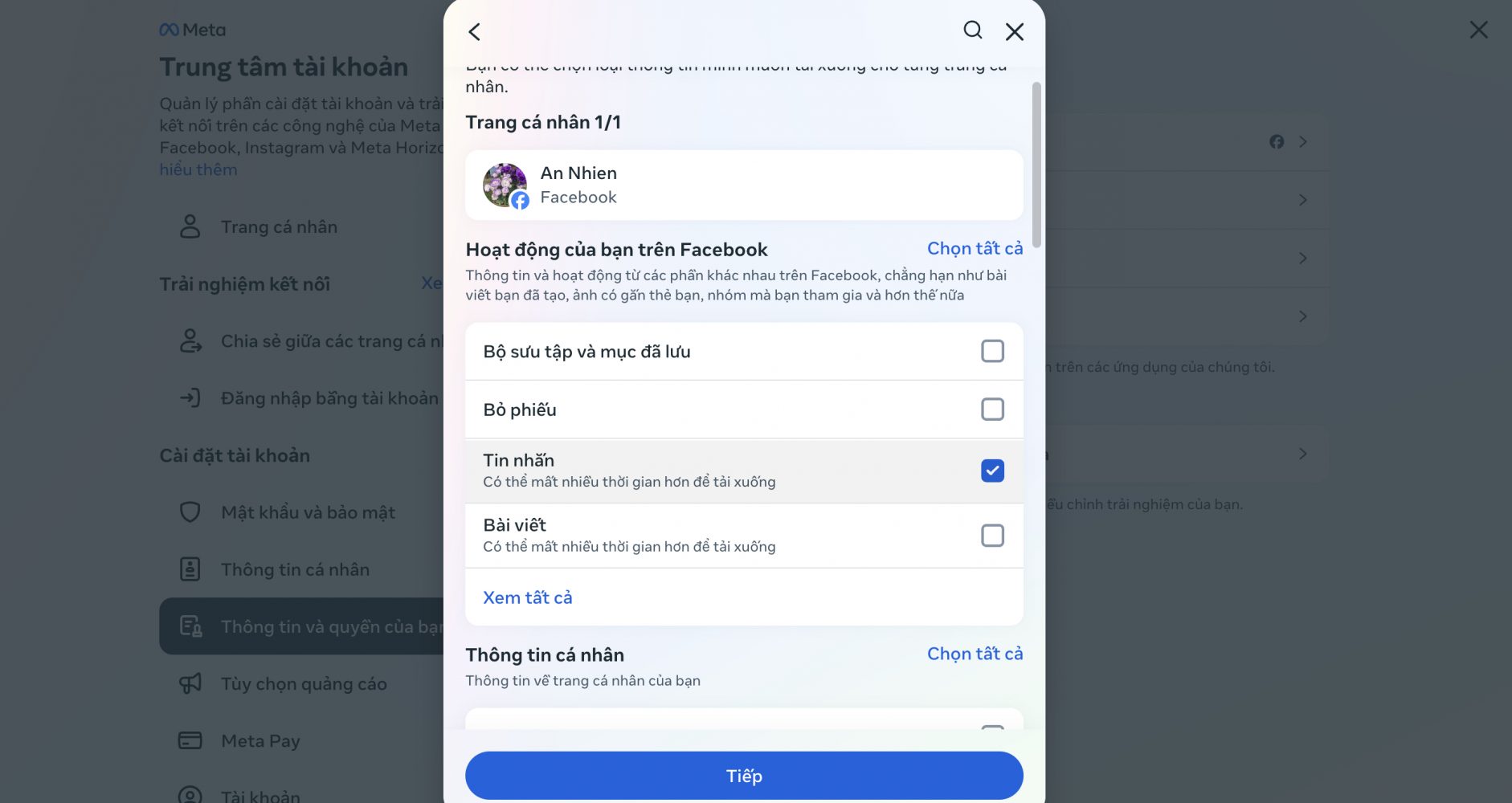 • Bạn cuộn xuống dưới, chọn mục “thông tin của bạn”, sau đó chọn “tải thông tin của bạn xuống” rồi nhấn vào “tiếp tục”.
