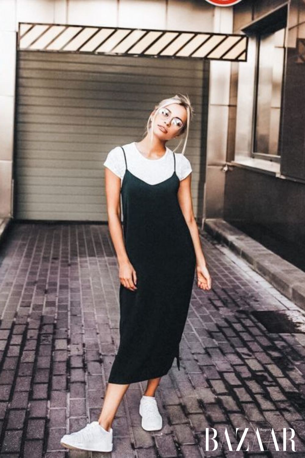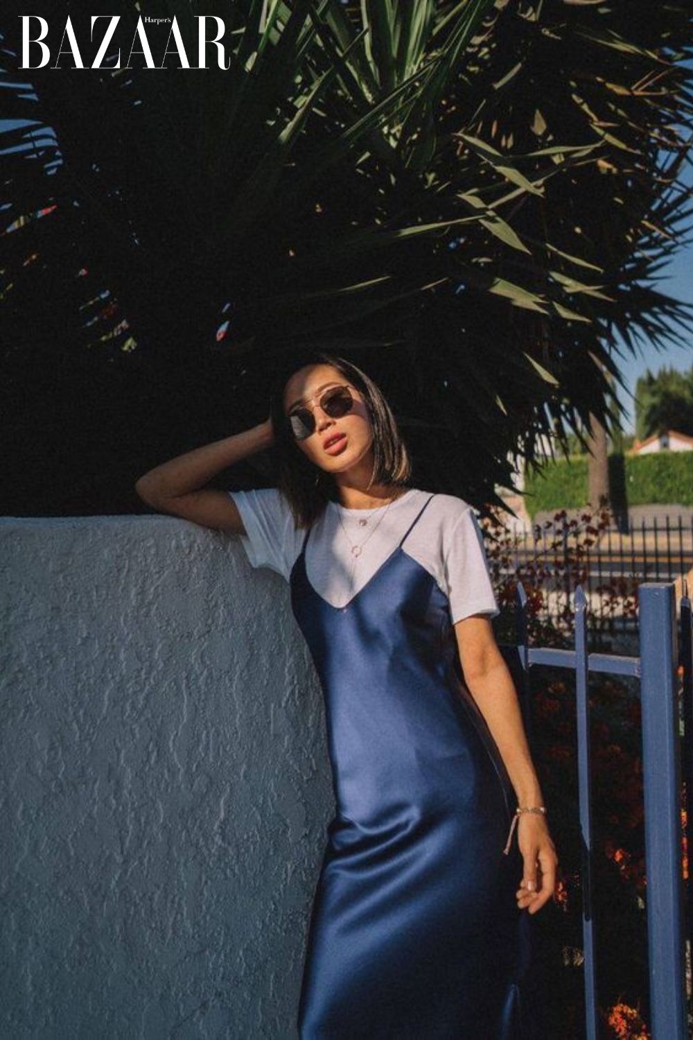 Slip dress over shirt – mặc đầm slip dress bên ngoài áo thun là cách ăn mặc kín đáo nhưng vẫn hợp thời trang. Ảnh: Melodie Jeng