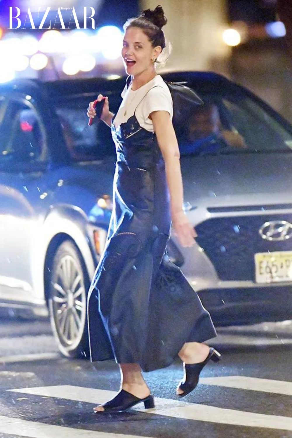 Từ phim ảnh ra đời thường, Katie Holmes lăng-xê cách mặc đầm slip dress với áo thun trong một buổi đi chơi ở New York ngày 7/5/2023. Chiếc đầm slip dress của cô xẻ ngực sâu và viền đăng-ten, hẳn sẽ vô cùng hớ hênh nếu mặc đơn lẻ. Nhưng khi phối ngoài áo thun trắn, kết hợp cùng giày cao gót đen và mái tóc buộc cao, nàng thơ của series phim Dawson’s Creek vô cùng sang trọng mà thoải mái. Với outfit đường phố ngày hôm đó, Katie Holmes đã làm “chấn động” các trang tạp chí và mạng xã hội.