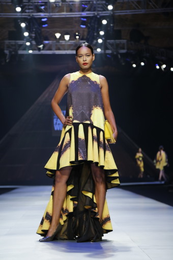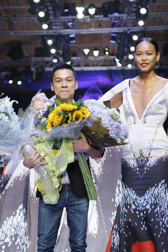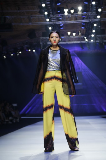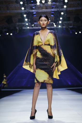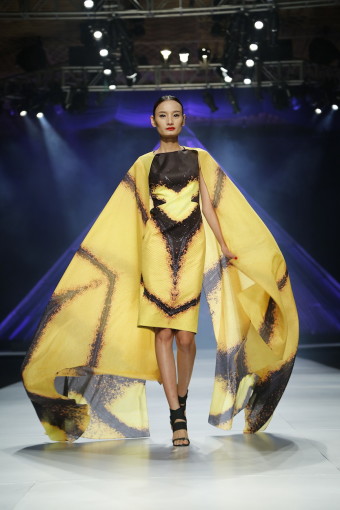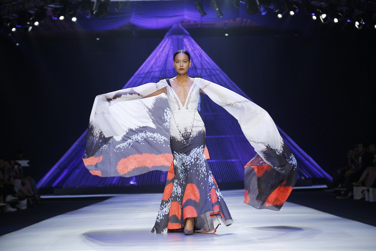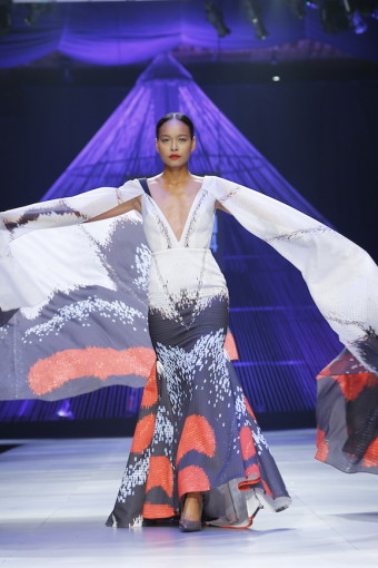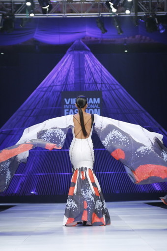 Người mẫu Lâm Thu Hằng kết show trong một thiết kế đầm ôm dài dáng đuôi cá với phần tay áo dang rộng phất phới, kết hợp cùng họa tiết tạo nên hiệu ứng đôi cánh bướm sải rộng khoe sắc, đúng như vẻ đẹp mà tạo hóa ban cho loài côn trùng này.