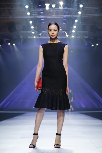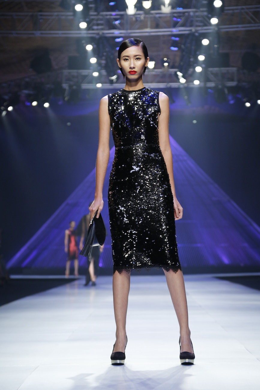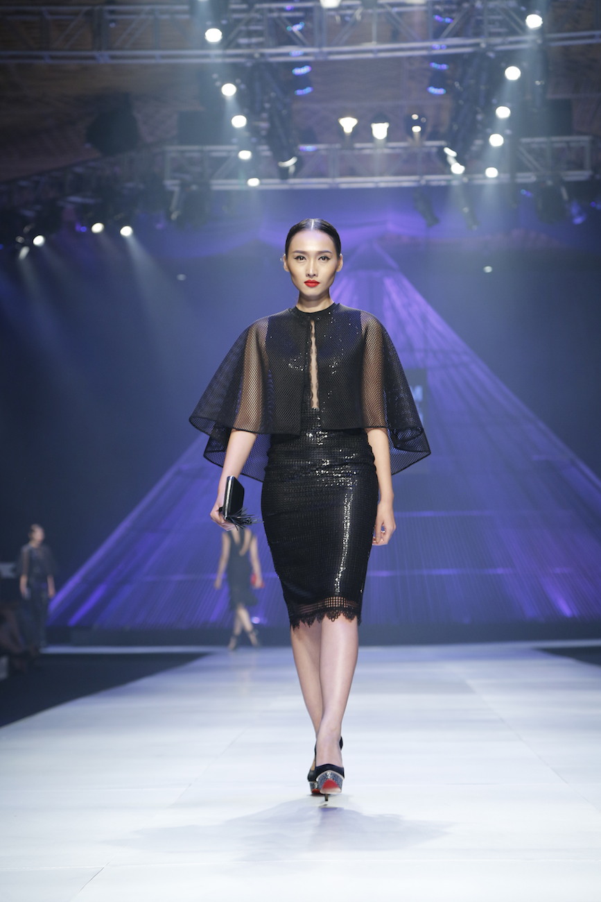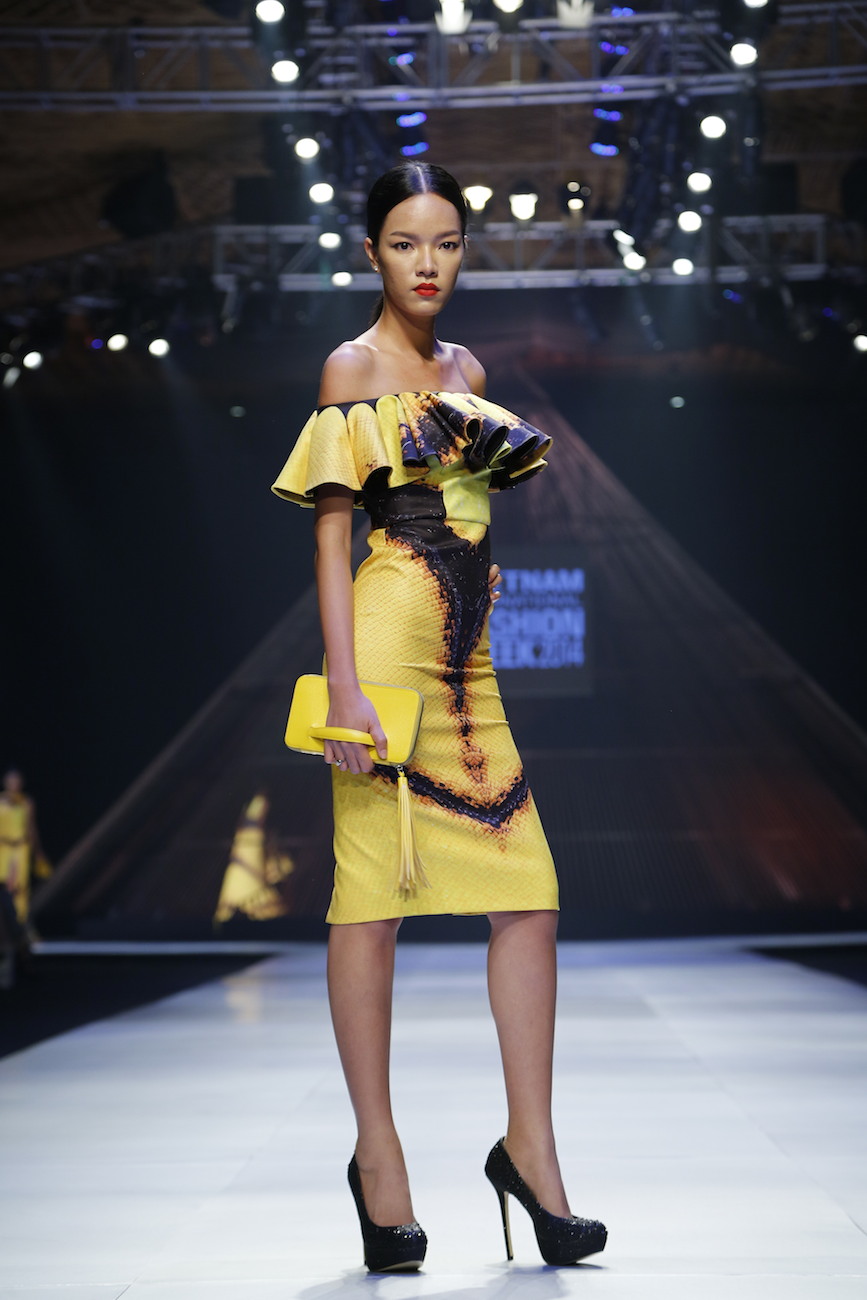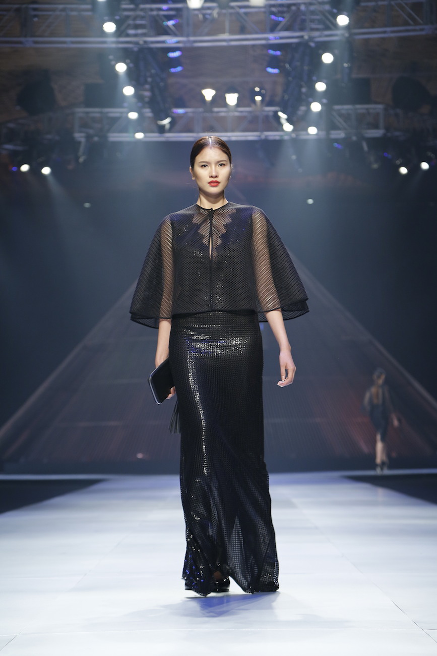 Phom dáng chiếm ưu thế là kiểu đầm bút chì, kiểu đầm chữ A suông rộng, thoải mái và dáng váy mullet trước ngắn sau dài thướt tha. Chất liệu kim sa và lưới được sử dụng với liều lượng nhỏ, là điểm nhấn cho một số kiểu đầm đơn giản. Những đường diềm đánh bèo khổ lớn ở chân váy và tay áo dài rũ điệu đàng là những chi tiết làm sáng tổng thể và tăng thêm phần nữ tính cho bộ sưu tập.