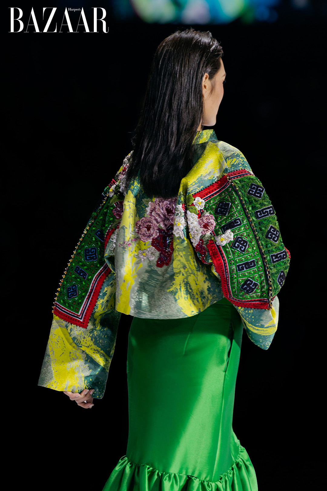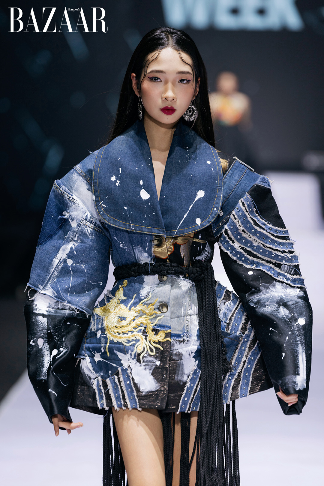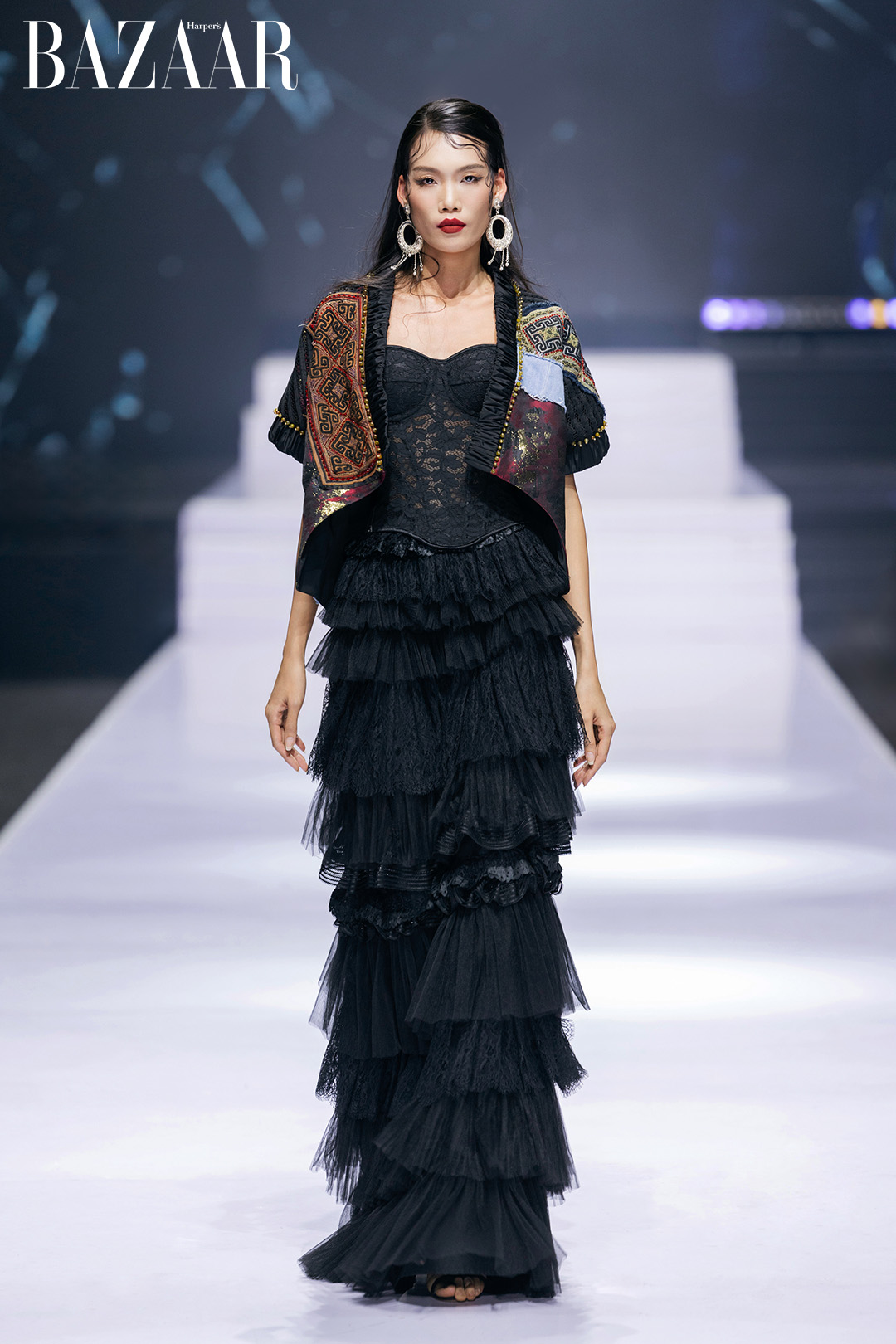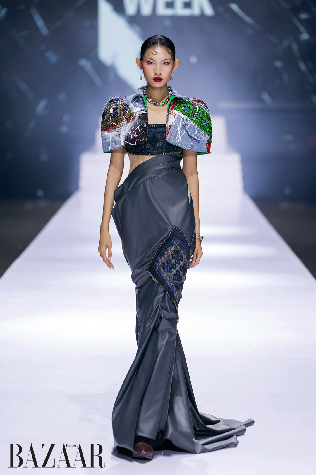 Nàng mẫu diện thiết kế lấy cảm hứng từ dáng váy quấn truyền thống, bộ trang phục được xử lý bằng chất liệu da bóng với kỹ thuật draping tạo phom sắc sảo. Phần áo khoác crop-top vai vuông phối các mảng denim và thổ cẩm tạo điểm nhấn mạnh mẽ, tôn lên tinh thần văn hóa trong ngôn ngữ thiết kế. Tổng thể mang sự hòa quyện giữa thủ công truyền thống và cấu trúc hiện đại, tạo nên hình ảnh thời trang cá tính và giàu bản sắc.