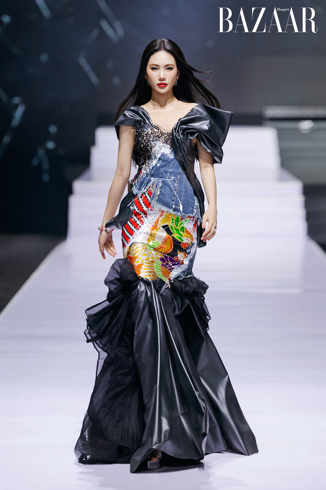 Khép lại hành trình, Hoa hậu Hoàn vũ Việt Nam Bùi Quỳnh Hoa xuất hiện đầy kiêu hãnh với thiết kế dáng đuôi cá được xử lý theo hướng tái cấu trúc, kết hợp tinh tế giữa denim, thổ cẩm thêu tay và các mảng đính kết thủ công tạo hiệu ứng thị giác nổi bật. Phần vai dựng phom mang tính điêu khắc, đối lập với phần tầng voan bồng nhẹ ở chân váy, tạo chuyển động mềm mại nhưng đầy kịch tính.