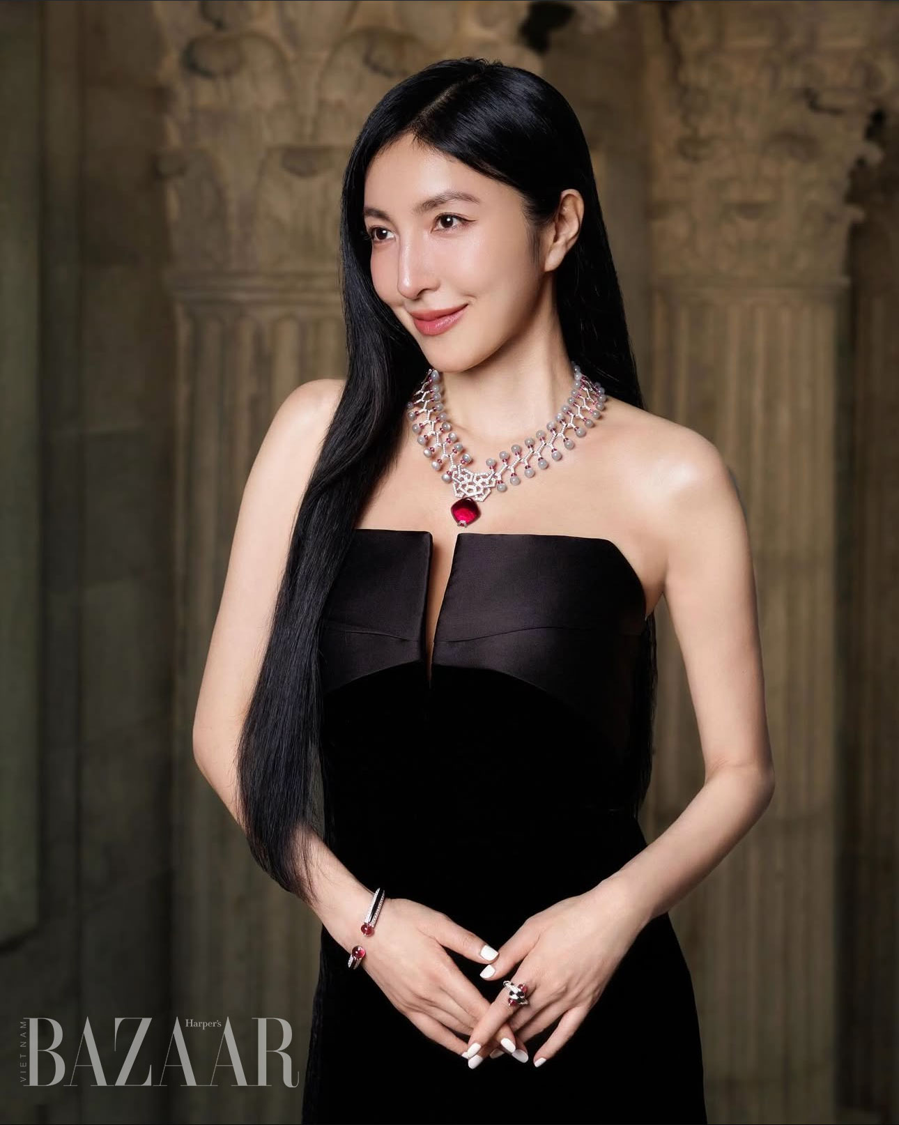 Chery Yang quý phái với đầm đen cúp ngực, làm nền cho vòng cổ, lắc tay và nhẫn Cartier. Ảnh: Cartier