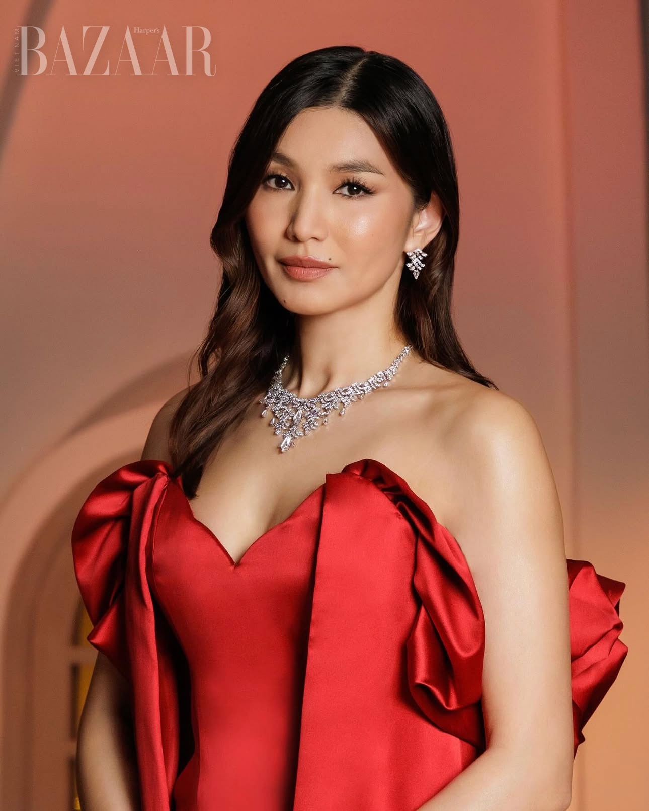 Gemma Chan trở thành tâm điểm ống kính với chiếc váy lụa đỏ và trang sức kim cương từ Cartier, mang theo một vẻ đẹp thách thức thời gian. Ảnh: Cartier