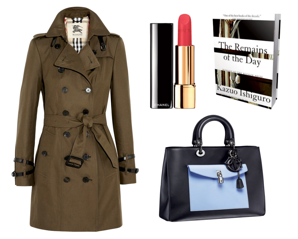 Sách The Remains of the Day, Kazuo Ishiguro; Túi, Christian Dior; Trench coat, Burberry; Son, Chanel