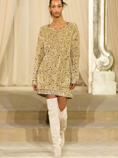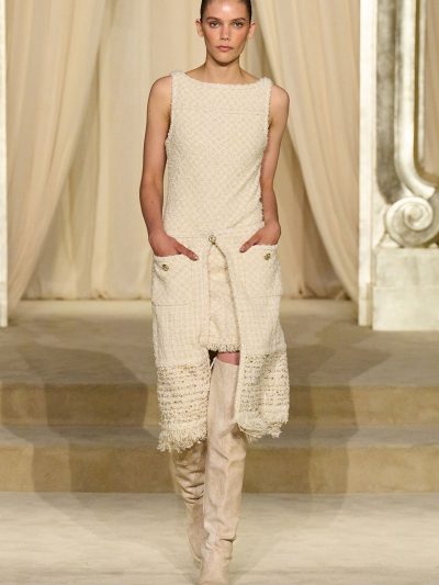 Trên ghế của mỗi khách mời được đặt một bó lúa mì màu vàng, như để nói rằng buổi trình diễn sẽ vô cùng đồng nội, dân dã. Tất nhiên trang phục đồng nội ở Chanel không có nghĩa là váy áo làm nông, nhưng những cảm xúc phóng khoáng, tự do tự tại của cuộc sống điền viên thể hiện rõ nét qua từng thiết kế.