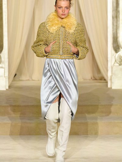 Matthieu Blazy bùng nổ ngay từ BST đầu tay cho Bottega Veneta vì cách anh xử lý chất liệu vải, dùng kỹ thuật đánh lừa thị giác (trompe l’oeil) để biến những gì bình thường thành phi thường. Ví dụ quần jeans hóa ra là quần da thuộc, váy tua rua làm từ da thuộc xé mỏng, hay túi xách tưởng như cỏ đan cũng là da thuộc nốt. Ở bộ sưu tập Chanel Haute Couture Thu Đông 2025, xuất hiện một mẫu áo khoác làm từ vải tweed trông khá giống với lông cừu shearling – đây hoàn toàn là một dấu ấn của Matthieu Blazy.
