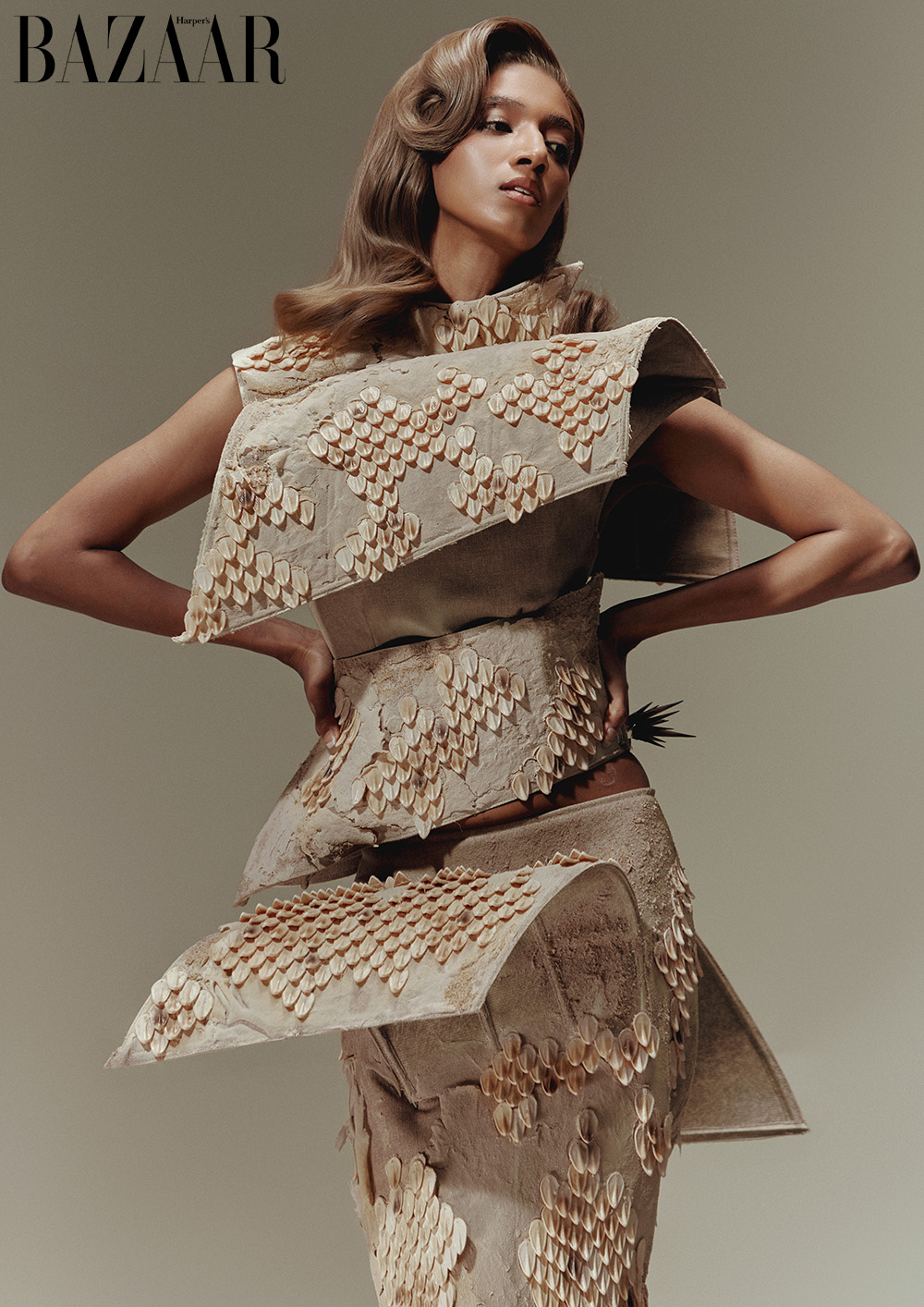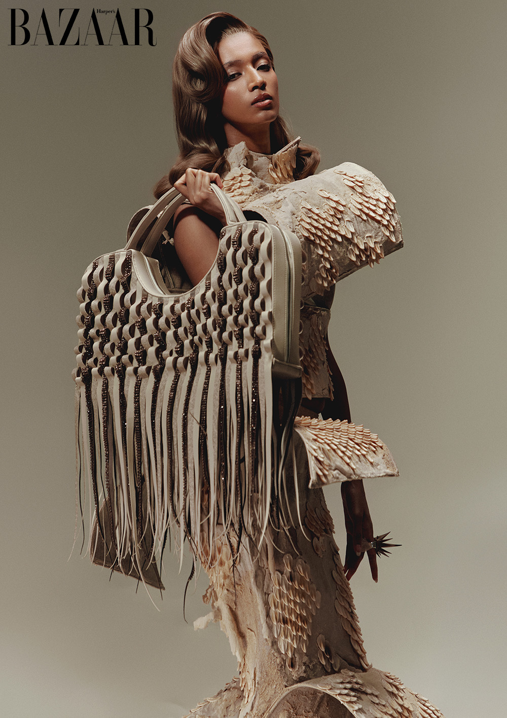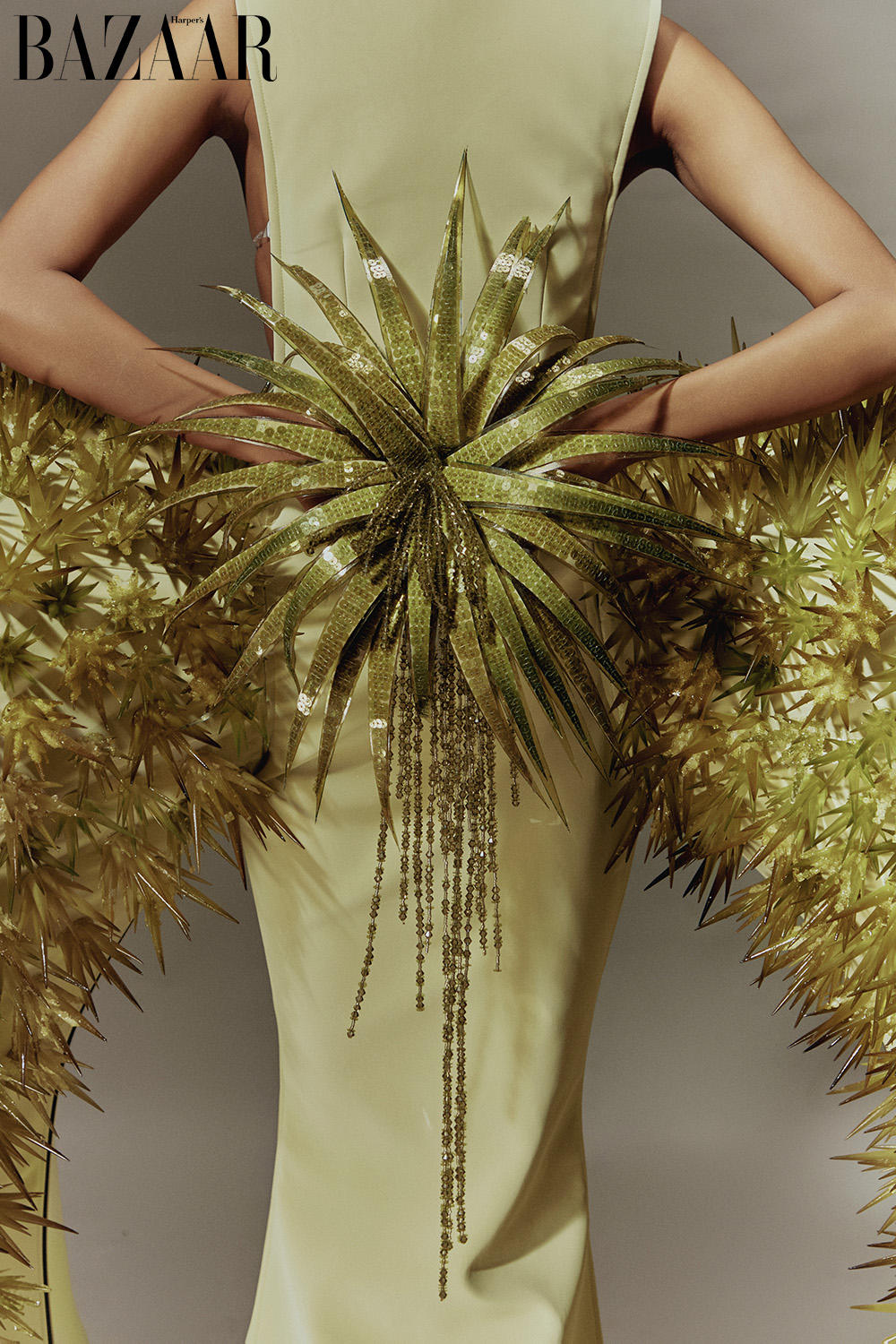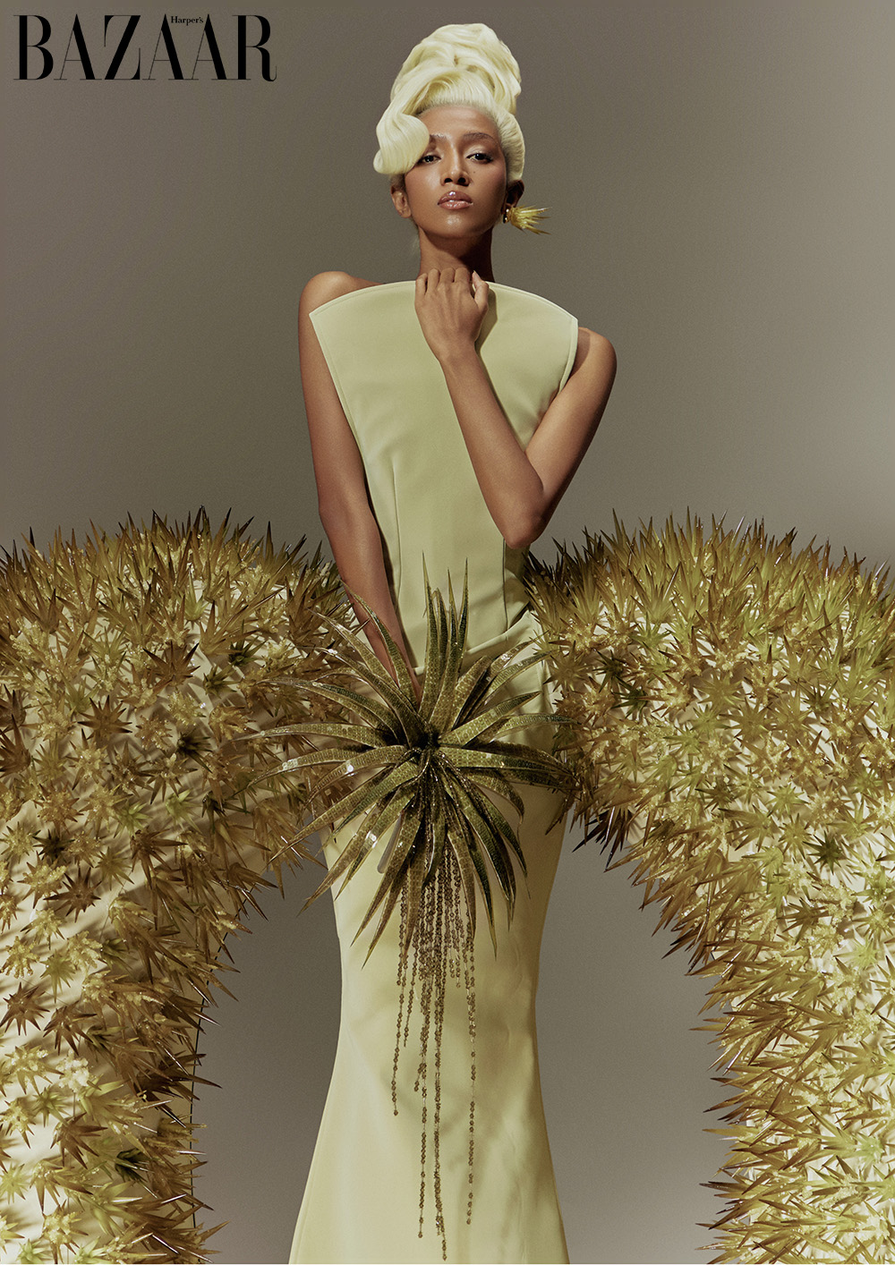 Thay vì chỉ khai thác hình ảnh một chiều, bộ sưu tập tái hiện sự đa dạng, màu mỡ và sống động của thảm thực vật nơi tưởng chừng khô cằn. Từ Jumping Cholla – loài xương rồng gai góc lấp lánh ánh nắng, đến Sidewinder – loài rắn cát mạnh mẽ uốn lượn trên nền sa mạc nóng bỏng, hay Joshua Tree – thân cây đặc trưng với tán lá tỏa ra như những cánh tay dang rộng, mỗi look trong bộ sưu tập là một lát cắt của tự nhiên được trau chuốt tỉ mỉ, vừa khoa học vừa nghệ thuật.