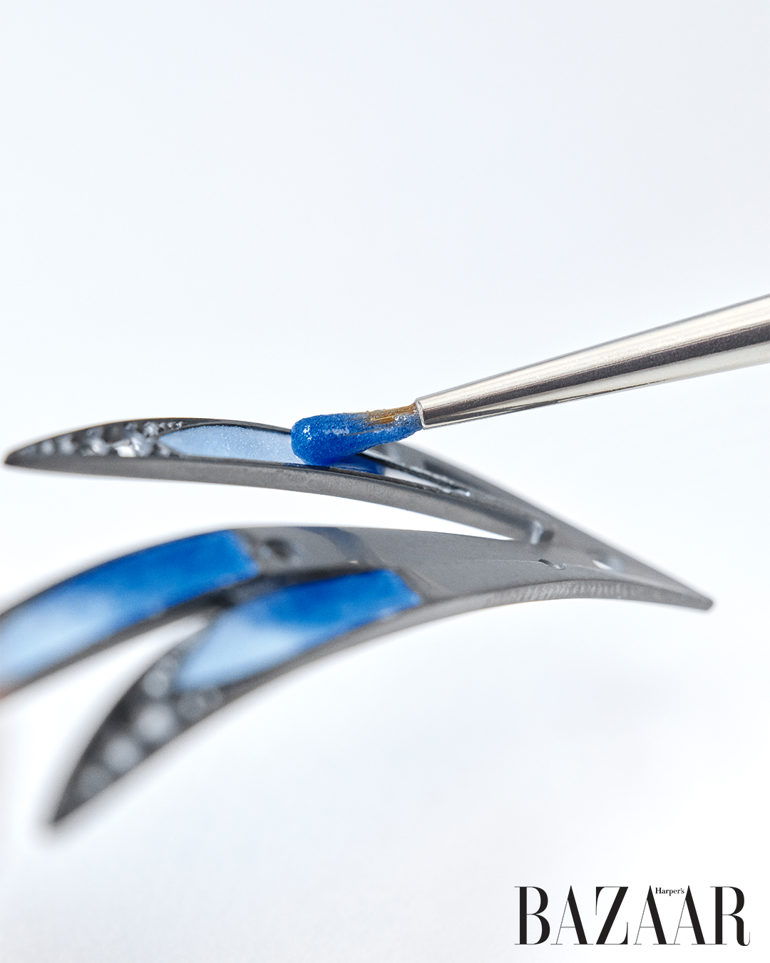 Lớp men Grand Feu được những viên sapphire Madagascar và Ceylon hảo hạng làm nền – những viên đá quý này được chọn lọc kỹ lưỡng để đồng điệu với dải màu của men, tạo nét chuyển mình liền mạch giữa chất liệu nhân tạo và khoáng vật tự nhiên.