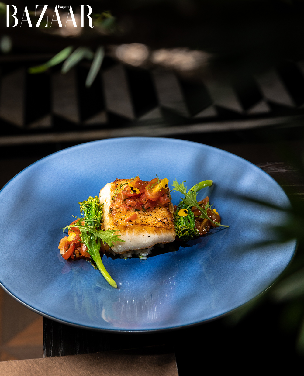 Ngoài ra, chúng tôi tự hào phục vụ cá bớp lên tuổi, một loài cá đặc sản tuyệt vời ở vùng biển Phú Quốc. Để tăng thêm hương vị, chúng tôi hun khô cá trong vòng bảy ngày, sau đó sử dụng phương pháp nấu chậm sous-vide. Món ăn được trình bày tinh tế với kem cá hồi, tỏi ngâm chua và các loại rau sống tươi. Sự kết hợp độc đáo này về hương vị và cấu trúc đảm bảo mang đến một cuộc hành trình đầy thú vị cho những khách hàng sành sỏi.