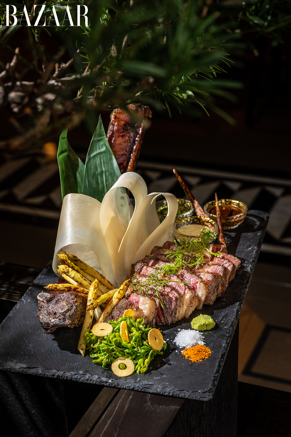 ANDY HUỲNH: Khách hàng sẽ được trải nghiệm những món mới thú vị tại Nhà hàng Oku. Một điểm nổi bật là thực đơn set mới Salon de Boeuf, nơi trưng bày những tảng thịt bò thượng hạng được chế biến ngay tại chỗ theo yêu cầu của thực khách. Miếng thịt bò ngon tuyệt với khẩu phần dành cho hai người được phục vụ kèm nhiều loại sốt đặc biệt như sốt ớt chuông nướng, wasabi hay sốt rượu và mật sim Phú Quốc, cùng các loại rau củ tươi ngon, đảm bảo mang đến trải nghiệm ẩm thực đáng nhớ.