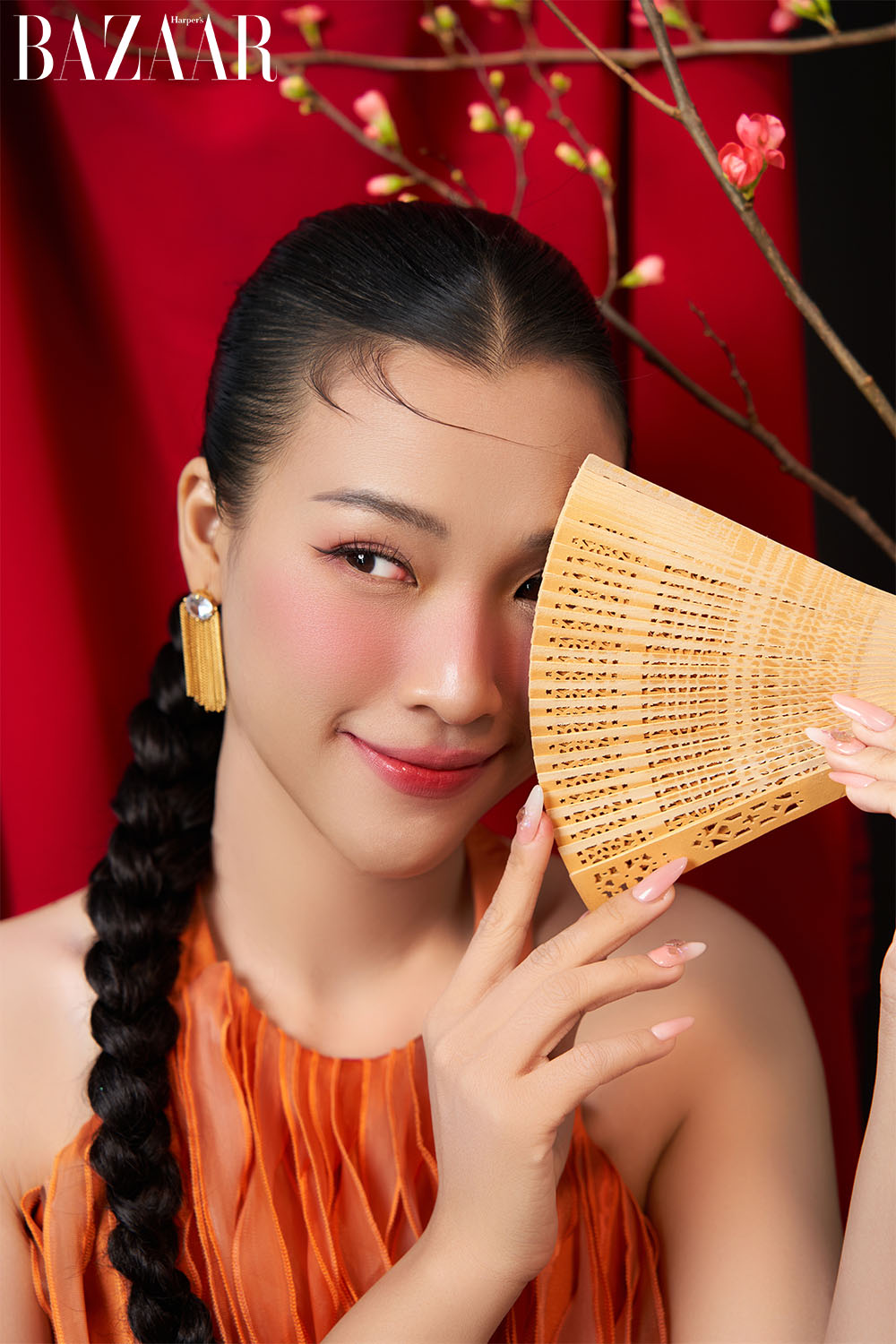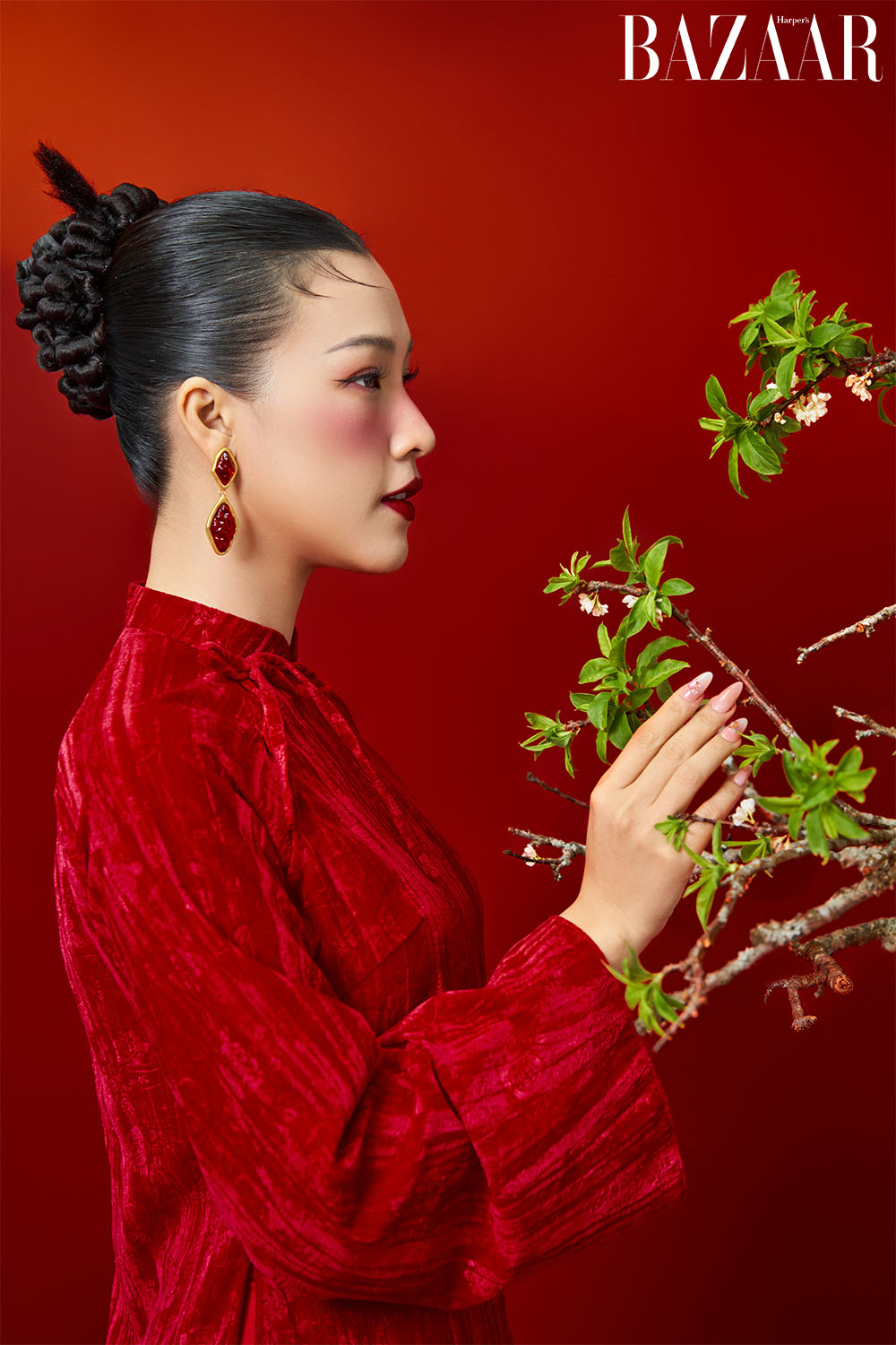 Á hậu, MC Hoàng Oanh đón Tết với bộ ảnh Giáp Thìn 2024 mang sắc đỏ ấm áp. Trong loạt trang phục truyền thống, cô khoe nét đẹp đậm chất Á Đông với kiểu makeup má hây hây hồng.