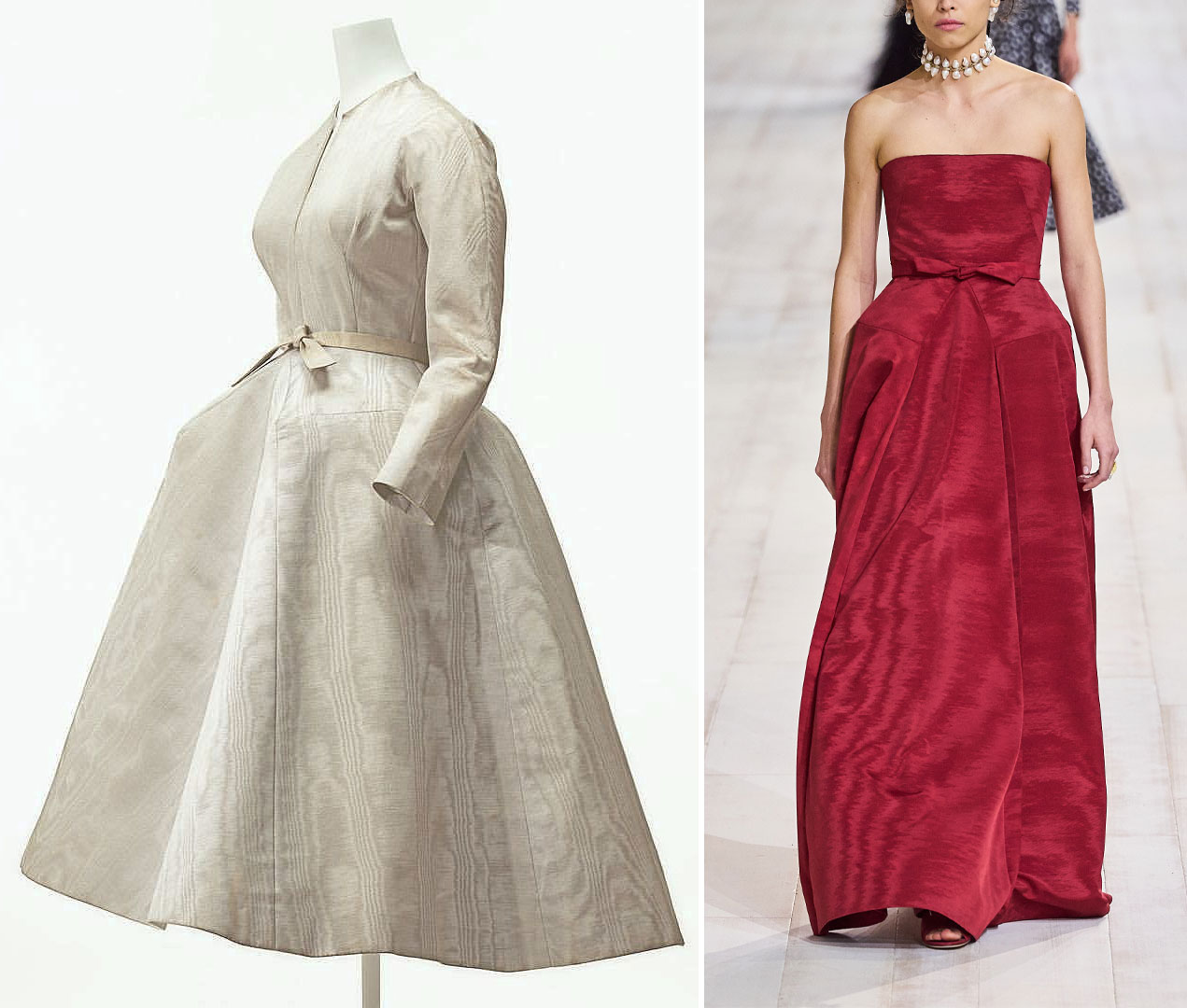 Trong lịch sử, lụa tơ tằm moiré chỉ được dùng cho thời trang dạ tiệc. Sau đó, quý ngài Christian Dior đã dân chủ hóa chất liệu này vào thập niên 1950 để dùng vào váy đầm mặc hàng ngày. Bây giờ, dùng lụa taffeta moiré cho bộ sưu tập haute couture, bà Maria Grazia Chiuri vừa tôn vinh lịch sử thương hiệu, vừa đề cao cảm giác nhẹ bỗng của trang phục, khiến ai cũng muốn ướm thử chúng lên người.
