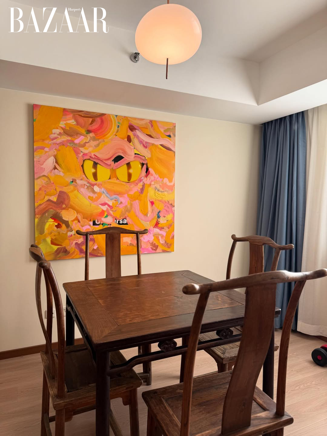 Những bức tranh treo trên tường không cạnh tranh lẫn nhau, mỗi tác phẩm giữ một khoảng thở riêng, hòa vào tổng thể nội thất. Đa số các bức tranh mà Chu Châu chọn đều là tác phẩm có khổ lớn, chiếm diện tích gần hết bức tường.
