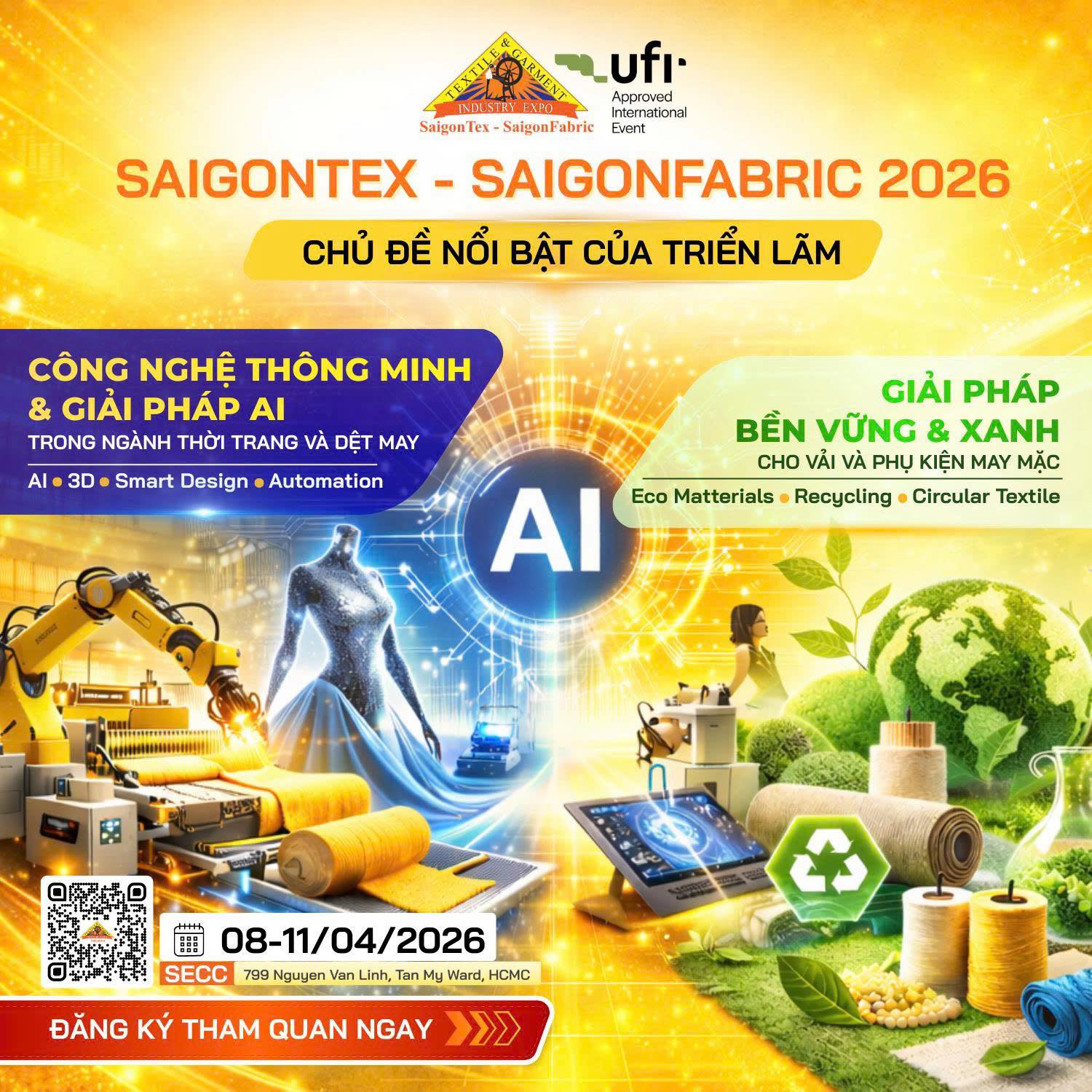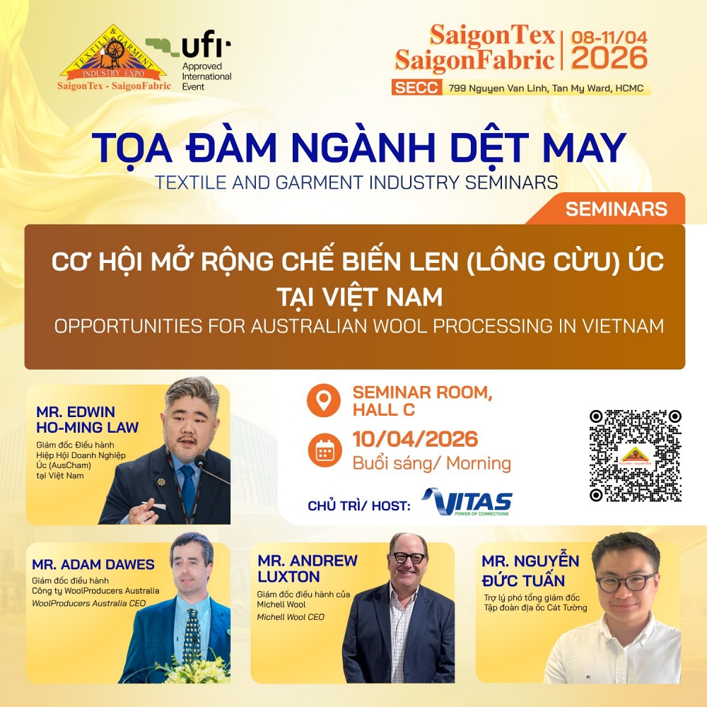 Triển lãm SaigonTex – SaigonFabric 2026 diễn ra từ ngày 8 đến 11/4 tại Trung tâm Hội chợ & Triển lãm Sài Gòn (SECC), TP.HCM. Đây là triển lãm quốc tế hàng đầu trong lĩnh vực dệt may, thiết bị, nguyên phụ liệu và vải. Đặc biệt, triển lãm này được UFI – Hiệp hội Triển lãm Toàn cầu công nhận.