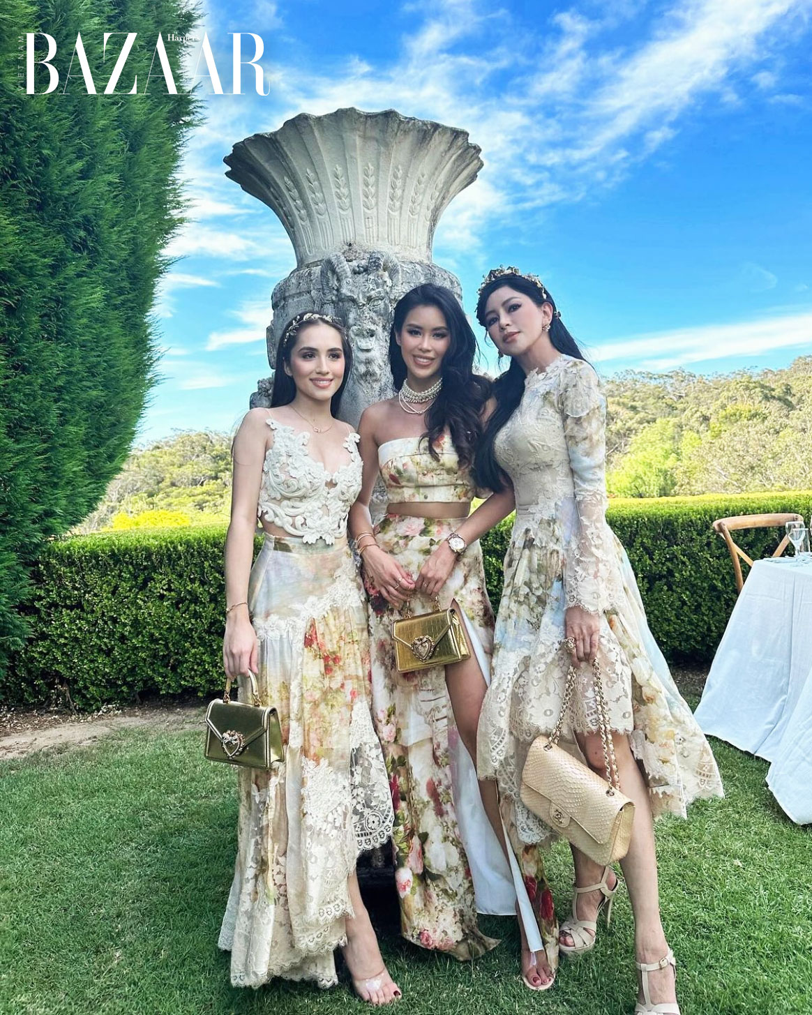 Diện mạo thiên tiên với những chiếc đầm ren hoa và túi xách màu vàng ánh kim. Hai chị em dâu lại ton-sur-ton với túi xách Dolce & Gabbana Devotion, trong khi doanh nhân Thủy Tiên chọn túi xách Chanel da rắn loại hiếm. Ảnh: Instagram @tiennguyen