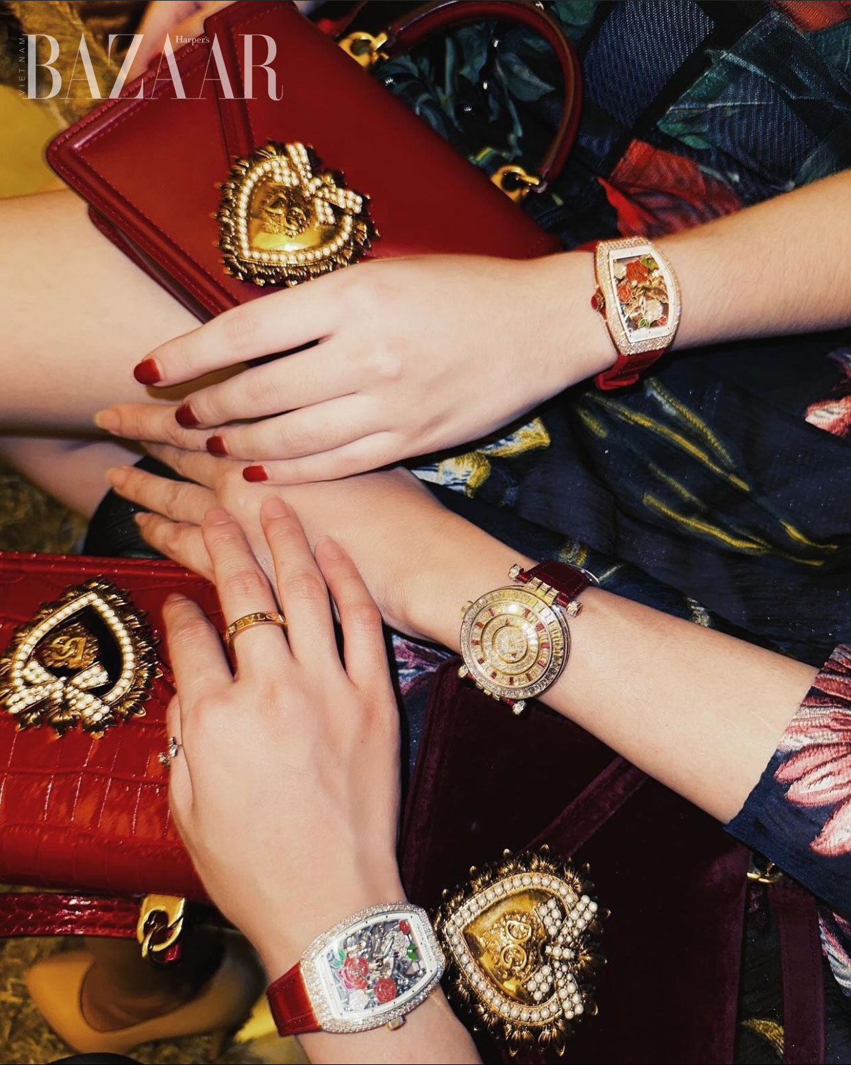 Bên cạnh đó, chị em dâu Tiên Nguyễn và Marie Trâm Anh còn có công thức diện đồ đôi để mẹ Thủy Tiên nổi bật lên hẳn. Ví dụ cho lần lên đồ này, hai chị em đeo đồng hồ xương Franck Müller Vanguard Rose Skeleton mặt họa tiết hoa hồng nạm kim cương, còn doanh nhân Thủy Tiên khác biệt hẳn với mẫu Chopard Imperiale nạm kim cương và hồng ngọc.