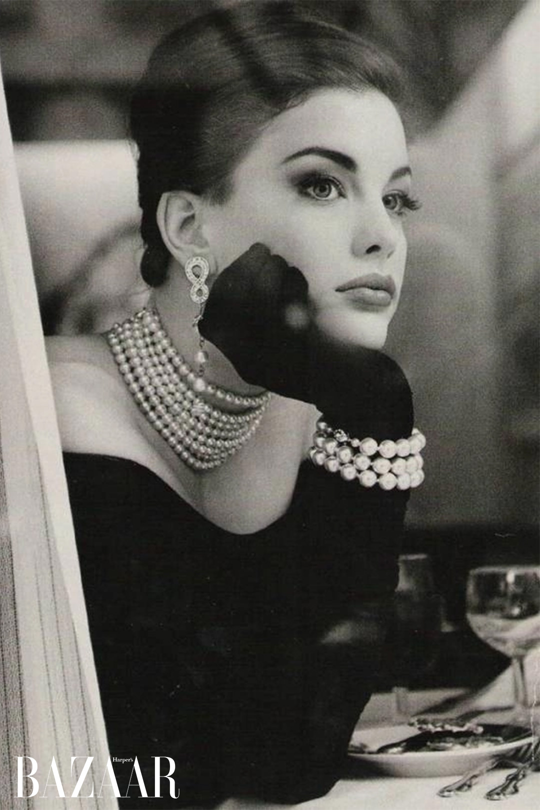 Đầu tiên, chắc chắn là Audrey Hepburn. Không cần nhắc đến quá nhiều chi tiết, chỉ riêng sự kết hợp giữa váy đen dáng gọn và vòng ngọc trai đã đủ để gợi nhớ đến khoảnh khắc bất tử của nữ minh tinh trong bộ phim Breakfast at Tiffany’s. Ở cả Cúc Tịnh Y và Audrey Hepburn, chiếc đầm đen không khoe dáng, mà làm nền cho chuỗi vòng ngọc trai quanh cổ, dẫn lối ánh nhìn lên gương mặt. Cả hai đều chọn sự tiết chế làm ngôn ngữ chính, để khí chất tự lên tiếng thay cho mọi tuyên bố thị giác.