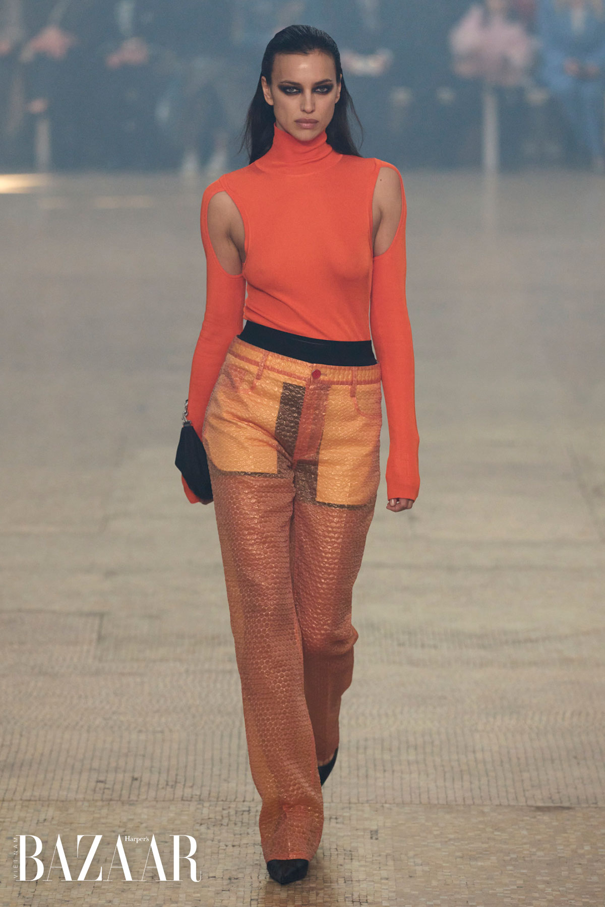 Sải bước cùng Dahan Phương Oanh trên sàn diễn Helmut Lang Thu Đông 2024 còn có Irina Shayk. Siêu mẫu nước Nga gây chú ý vì là một trong những người mẫu duy nhất mặc trang phục màu sáng. Bộ sưu tập lần này chủ yếu được bao phủ bởi sắc trung tính, đậm màu và gợi nhắc đến đường phố New York lạnh lẽo trong mùa cuối năm.