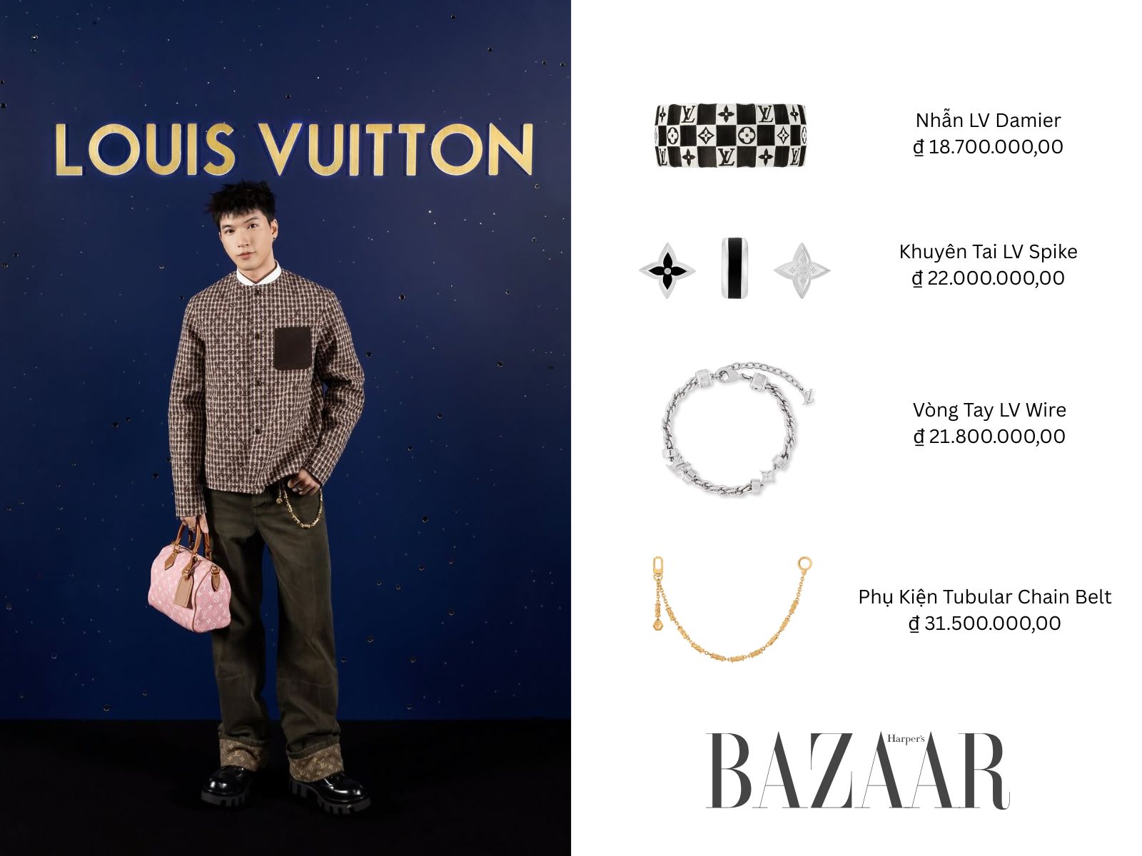 Đi kèm với outfit, HIEUTHUHAI lựa chọn loạt phụ kiện cũng tới từ nhà mốt Pháp. Khuyên tai LV Spike dành riêng cho nam giới, thắt lưng Tubular Chain Belt ánh kim, vòng tay LV Wire, nhẫn LV Lozine và LV Damier, tất cả đều được xử lý trên nền bạc Sterling, giao thoa giữa di sản và tinh thần hiện đại.