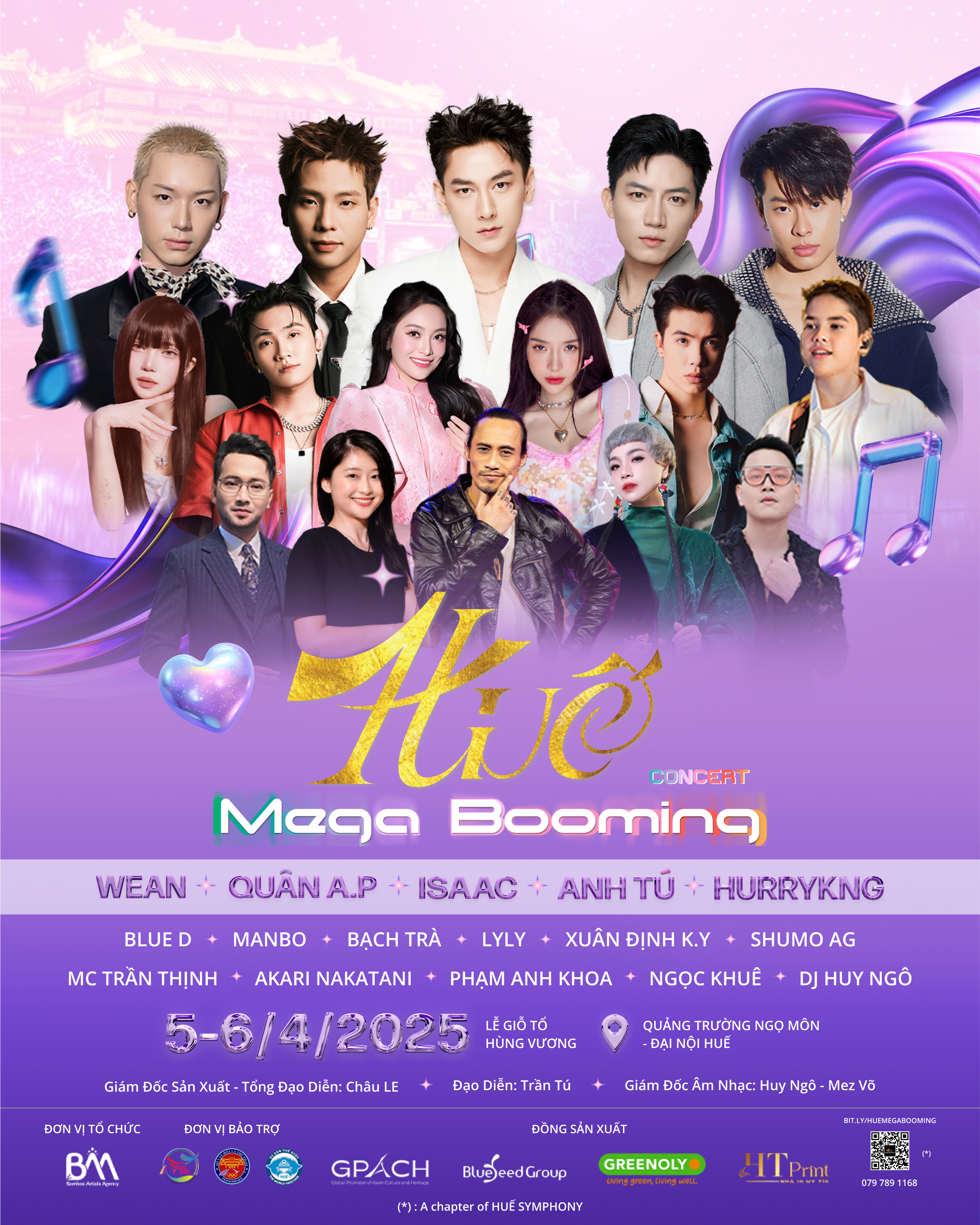 Đại nhạc hội Huế Mega Booming quy tụ dàn nghệ sĩ đa dạng, từ những tên tuổi hàng đầu làng nhạc Việt đến những tài năng trẻ đang được yêu thích. Nổi bật nhất là dàn Anh Trai Isaac, Anh Tú Atus, Quân A.P, WEAN, HURRYKNG.