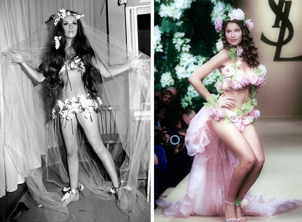 Lần đầu tiên được giới thiệu năm 1968, sau đó được tái hiện vào mùa Xuân 1999, váy cưới hoa hồng của Yves Saint Laurent thực tế là bộ bikini hai mảnh được đơm kết hoa vải. Táo bạo và nữ tính, quyến rũ và dịu dàng. Khi được hỏi về thiết kế, Yves Saint Laurent nói: “Nó không phải là sự khiêu khích. Mà nó đại diện cho sự nữ tính vĩnh hằng.”