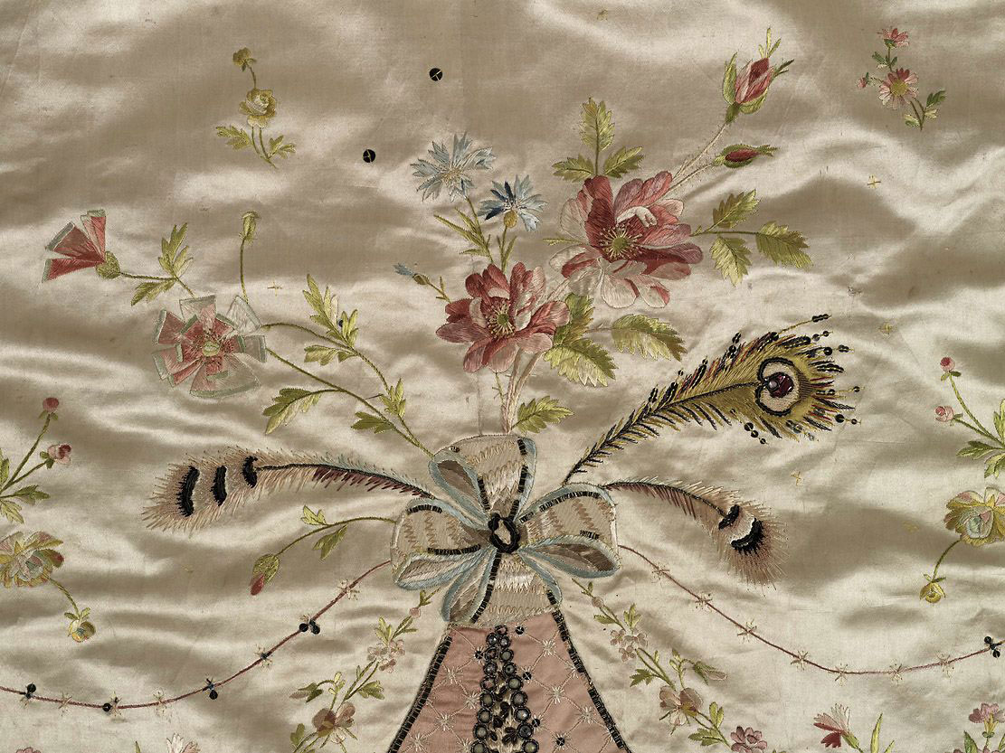 Chiếc váy này đã bị sửa phom dáng khi sang tay chủ mới trong những thế kỷ sau – cụ thể, phom dáng pannier trong thế kỷ 18 đã bị đổi thành đầm corset kiểu thế kỷ 19 – nhưng vẫn duy trì được chất liệu thêu tay lộng lẫy hình hoa hồng, lông công và chi tiết lông gà lôi. Giới mộ điệu phải ngưỡng mộ chất lượng của mẫu thiết kế vì dù hơn 200 tuổi vẫn không phai màu.