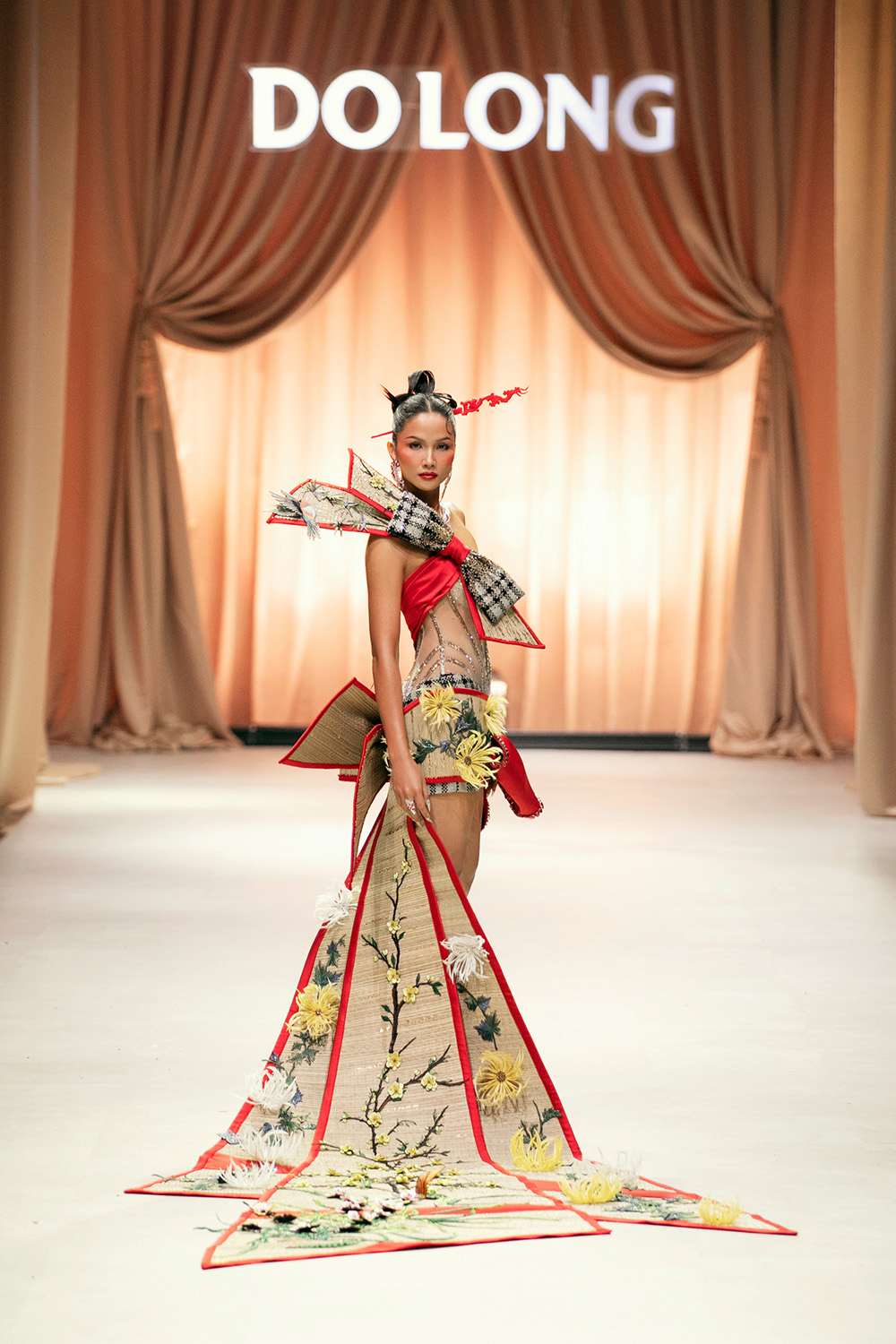 Theo NTK Đỗ Long, mẫu đầm của Daiyaana được lấy cảm hứng từ bộ tranh tứ bình mai – lan – cúc – trúc, khắc họa vẻ đẹp kiêu hãnh, thanh cao và bất diệt của người phụ nữ Á Đông, kết hợp cùng chất liệu chiếu cói truyền thống Việt Nam.