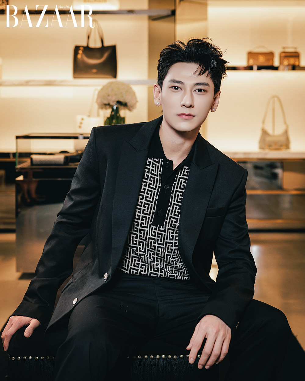 Isaac gây ấn tượng với phong thái lịch lãm trong bộ vest kết hợp áo polo monogram PB – hoạ tiết mê cung trứ danh.