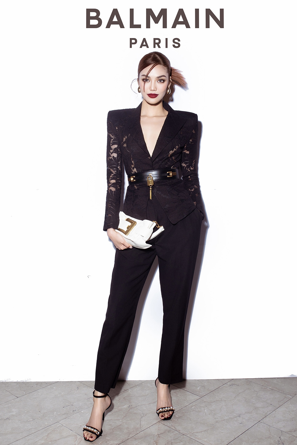 Lan Khuê khẳng định hình ảnh “nữ tướng thời trang” với bộ vest đen quyền lực phối cùng clutch Anthem trắng, thể hiện đúng tinh thần power dressing đặc trưng của Balmain