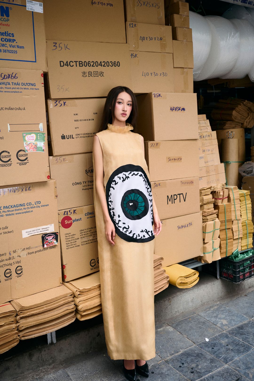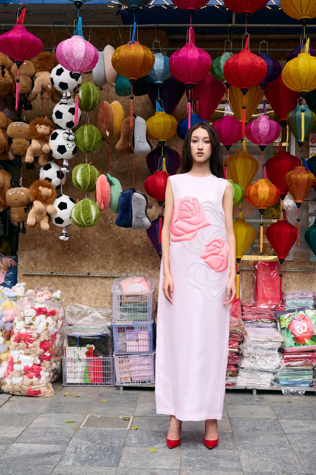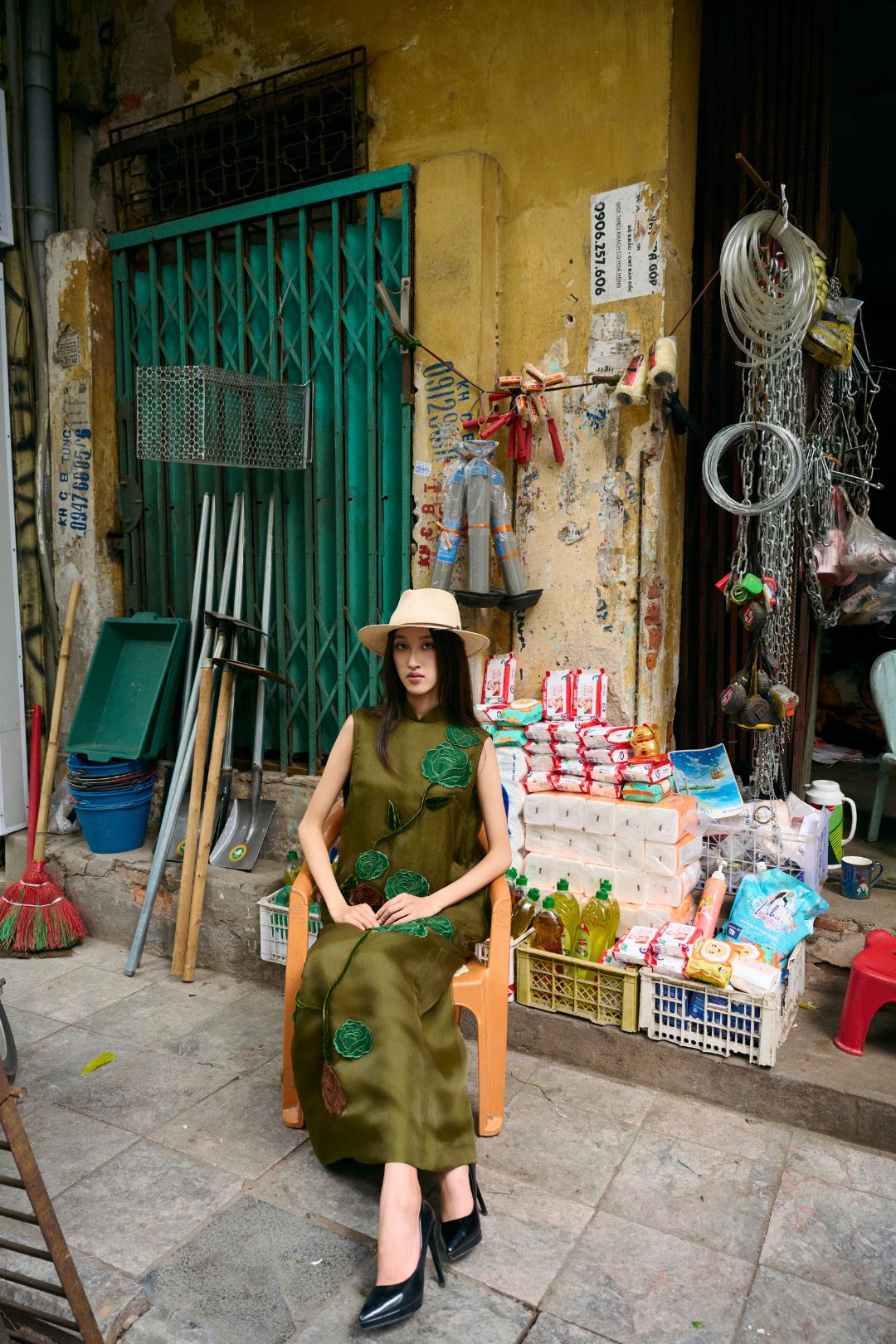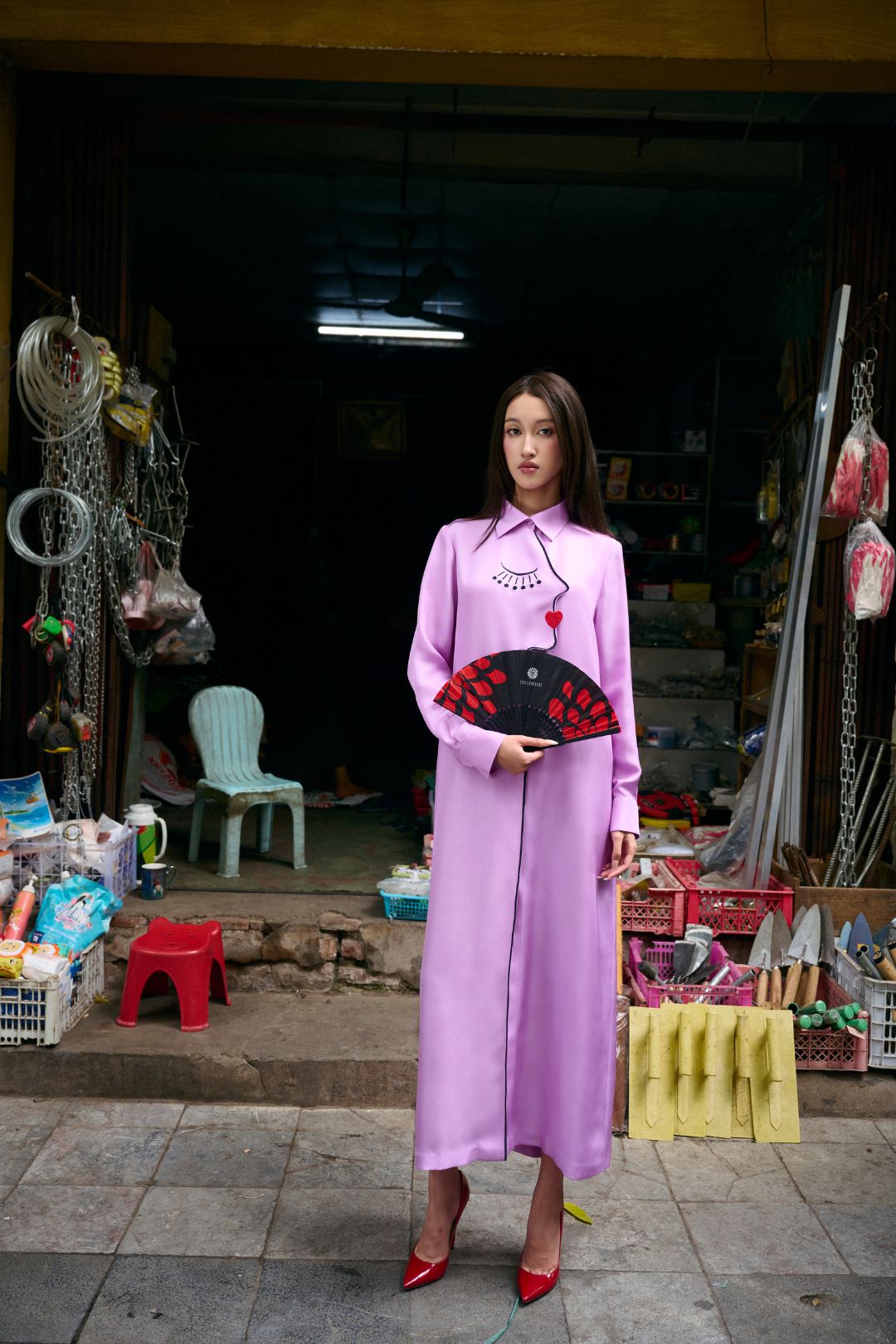Dưới ống kính nghệ thuật, những thiết kế mang tinh thần Á Đông không còn đứng yên để ngắm nhìn. Chúng trở thành những “tác phẩm chuyển động” hiện diện giữa những cửa hàng kim khí, những tiệm thuốc đông y thơm nồng mùi thảo mộc. Cách tiếp cận này giúp xóa nhòa ranh giới giữa tính trình diễn xa hoa và sự gần gũi của đời thường, biến mỗi bước đi của người phụ nữ trở thành một phần của nhịp sống đô thị.