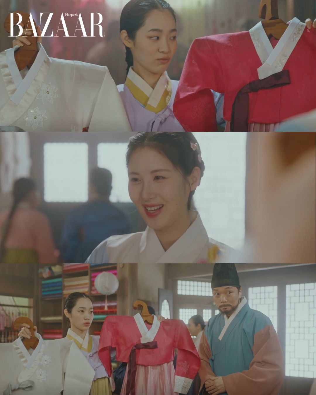 Cảnh mua sắm nơi Cha Seon Chaek đụng độ phản diện Do Hwa Seon (Ji Hye Won) lướt qua những món phục sức, thủ sức quan trọng như thắt đuôi tóc daenggi, túi thơm hyangnang, quạt buchae… Và một phục trang quý mà cả hai cô gái tranh giành làm từ lụa saenggosa.