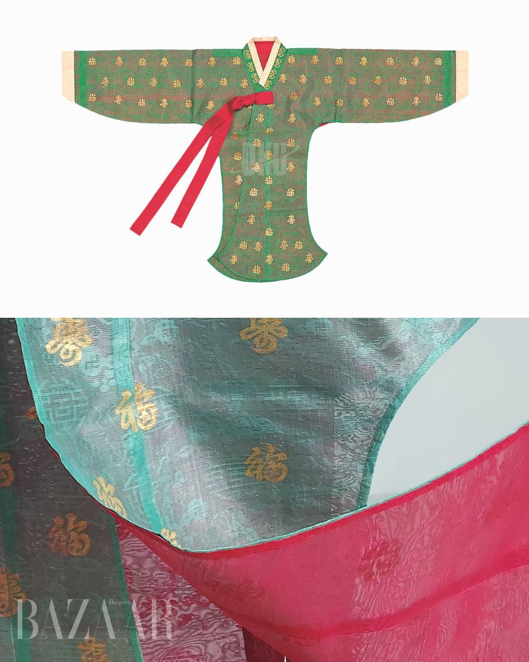 Ảnh trên: Dangui, áo lễ phục dành cho phụ nữ quý tộc từ niên đại 1900 tại bảo tàng Seokjuseon. Hiện vật gồm hai lớp áo đơn ghép lại. Lớp ngoài được làm từ vải saenggosa màu xanh lá, lớp trong được làm từ saenggosa màu hồng phấn, sau đó hai áo được ghép lại, phần mép áo được gia cố. Toàn bộ bề mặt ngoài áo được trang trí bằng họa tiết chữ “thọ phúc” (壽福) bằng vàng, và cổ áo được in hoa văn dơi bằng vàng để trang trí. Ảnh dưới: Ảnh thực của hiện vật. Ảnh: Seokjuseon Memorial Museum; Twitter/X