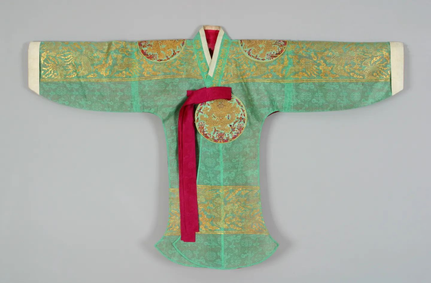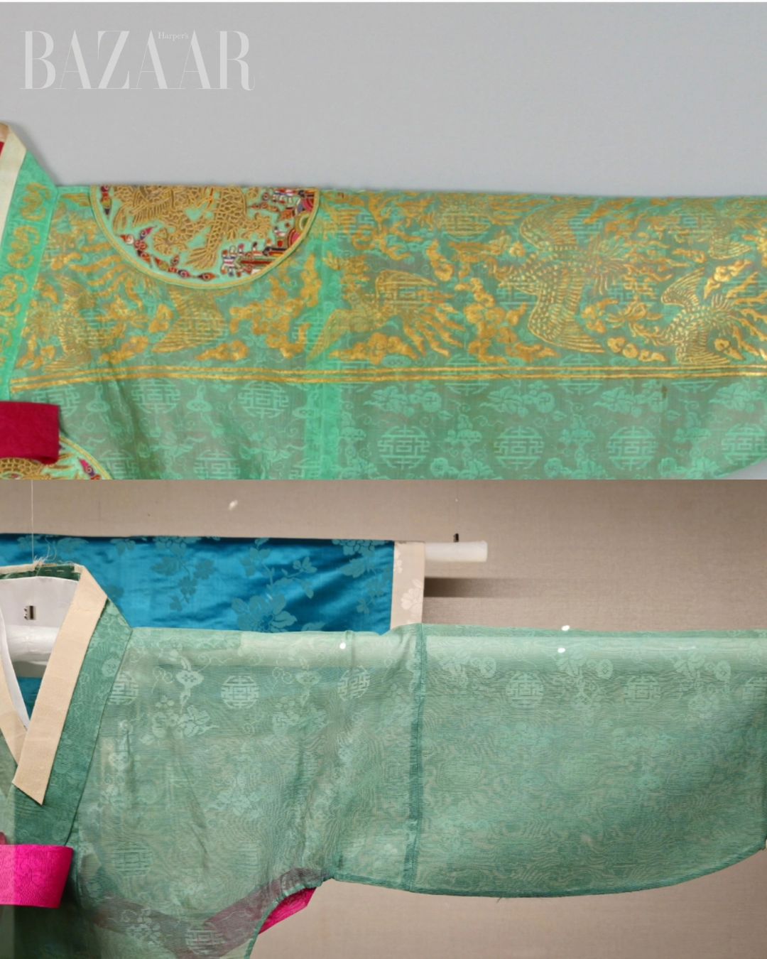 Chiếc dangui mà phụ nữ hoàng tộc và phu nhân tầng lớp sĩ đại phu mặc tuy cũng được may từ cùng chất liệu saenggosa nhưng có sự khác biệt rõ rệt: Chiếc dangui màu xanh tùng của gia tộc Maeng Hyeon-ga mang sắc trầm cổ điển (dưới), trong khi chiếc dangui màu xanh non của Vương phi Đức Nhân (trên) lại được trang trí họa tiết mây và hạc bằng vàng ép, cùng với miếng bo thêu rồng ngũ trảo. Ảnh: Kyungwoon Museum