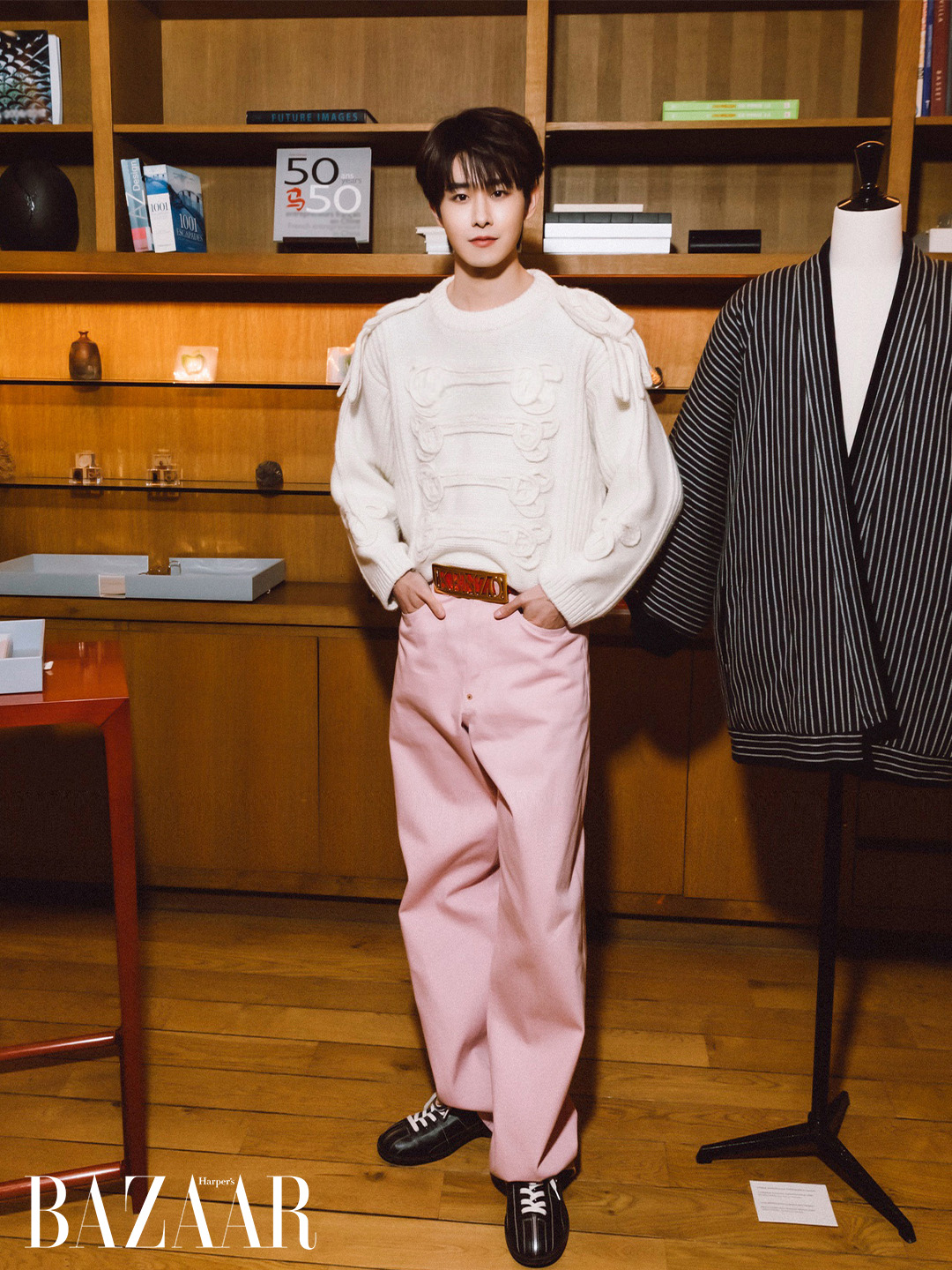 Thay vì theo đuổi vẻ ngoài quá sắc nét, Điền Gia Thụy lựa chọn cách tiếp cận mềm mại: từ suit camouflage gợi retro đến knitwear tối giản. Tổng thể hình ảnh giữ được sự gần gũi, đúng với tinh thần phóng khoáng mà Kenzo đang theo đuổi trong những mùa gần đây. Chính sự cân bằng này giúp hình ảnh công bố tạo được thiện cảm với giới mộ điệu.
