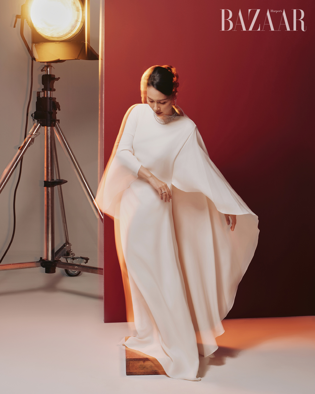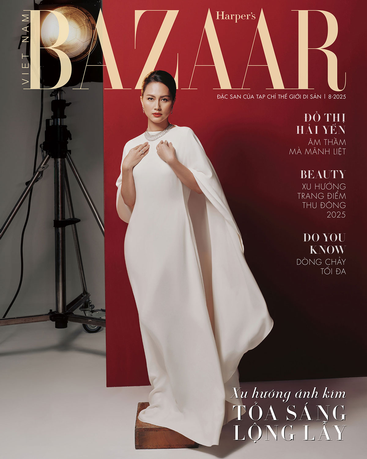 Diễn viên điện ảnh Đỗ Thị Hải Yến trên trang bìa Harper’s Bazaar Việt Nam, 8/2025. Hoa tai Pluie de Cartier, vàng trắng 18K và kim cương. Vòng cổ Pluie de Cartier, vàng trắng 18K và kim cương. Nhẫn Reflection de Cartier, vàng trắng 18K và kim cương. Đầm lụa Ecru Cady thuộc bộ sưu tập Dior Thu 2025.