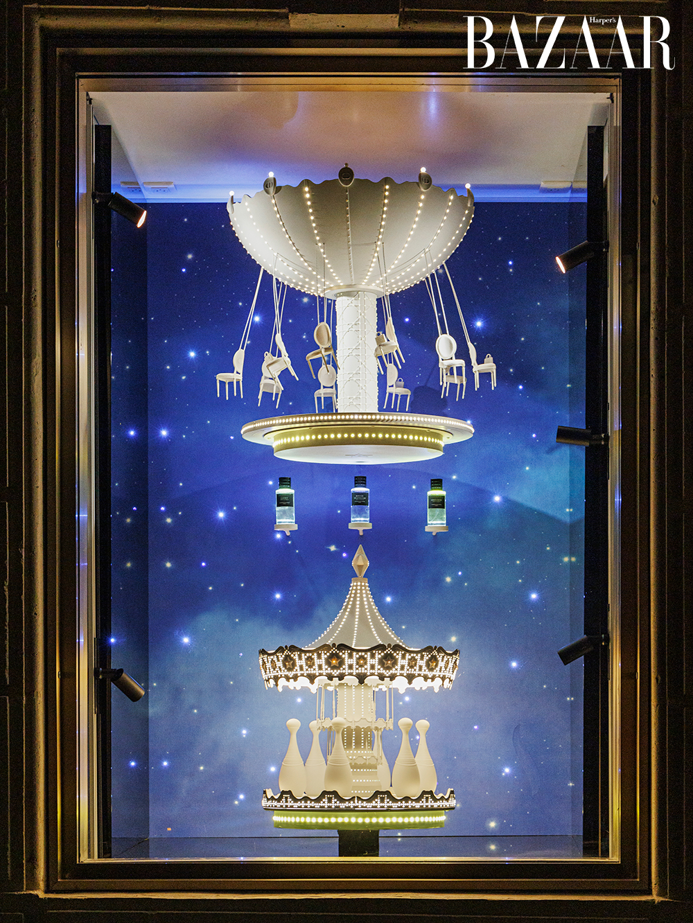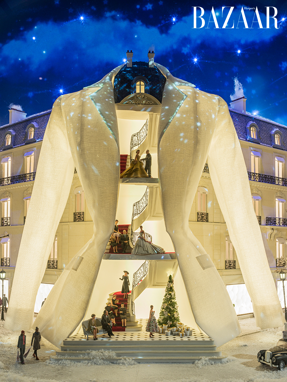 Khi màn đêm buông xuống, mặt tiền tòa nhà 30 Montaigne của Dior bừng sáng với một màn trình diễn ánh sáng độc đáo. Những chiếc đồng hồ cuckoo vui nhộn nhảy múa trên tường, hòa cùng hàng nghìn điểm sáng lấp lánh, tạo nên một bức tranh sống động về Paris và những biểu tượng bất hủ của Dior. Từ ngôi sao may mắn đến bộ suit Bar đặc trưng, từ chiếc túi Lady Dior thanh lịch đến Saddle phóng khoáng – tất cả đều “thức giấc” trong một vũ điệu thiên thể kỳ ảo mỗi tối.