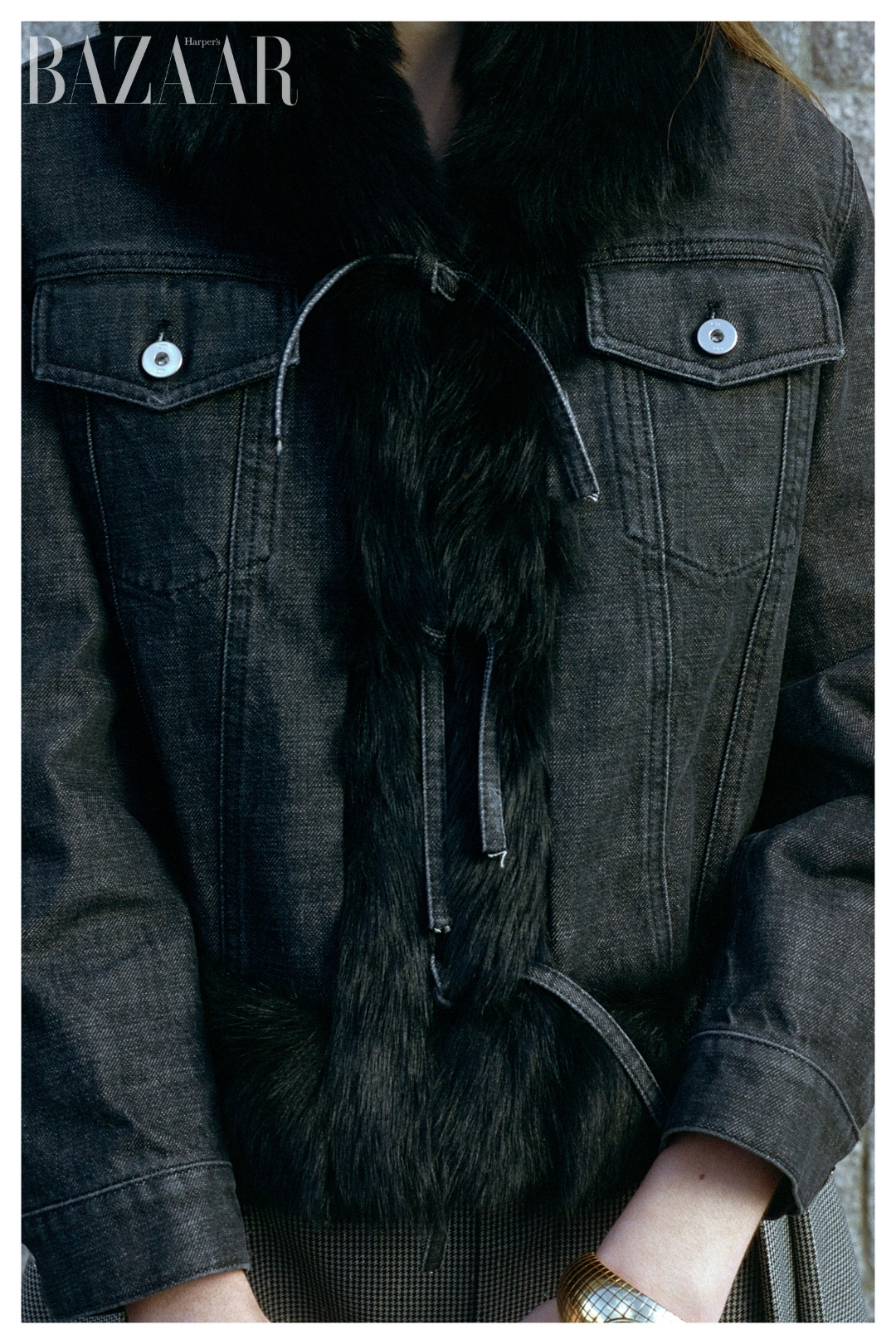 Trên chiếc áo khoác len kết hợp khăn choàng cắm chiếc nút dưới dạng ghim cài vui mắt. Váy sơmi đơn giản nhưng không cơ bản với dải dây ngọc trai đong đưa bên hông. Áo khoác denim lót lông được điểm thêm hàng dây buộc nơ thật mảnh để mang chút sự mơ mộng cho những cô gái thành thị.