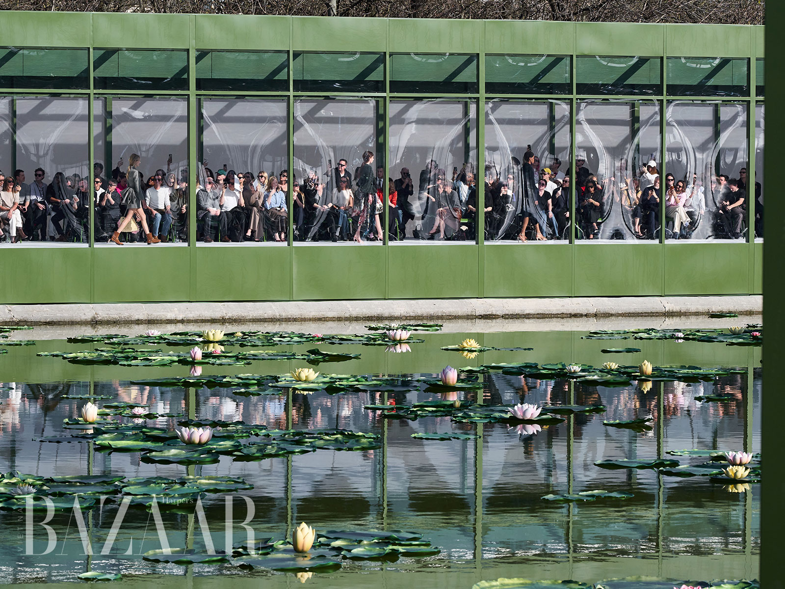 Sau nhiều show diễn được tổ chức trong nhà, Dior Thu Đông 2026 đã di chuyển ra không gian ngoài trời của Jardin des Tuileries. Nếu khách quan đã quen với hình ảnh không gian bên trong thì nay, họ trầm trồ khi thấy Dior dựng một sàn diễn bắc ngang hồ bát giác, được trang trí với những bông súng sặc sỡ cùng lá to bản.