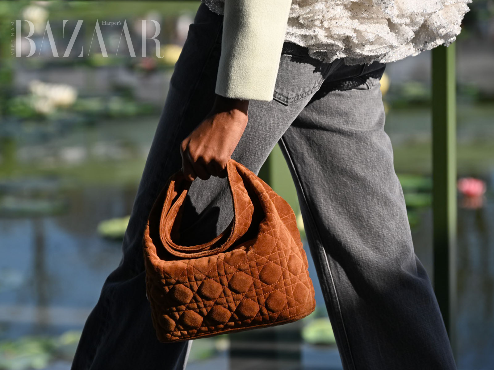 Một cuộc dạo chơi trong công viên không thể thiếu những chiếc túi đi kèm. Xuất hiện một mẫu túi trông khá giống với túi đựng hộp cơm phù hợp để đi picnic, tất nhiên là làm từ da thuộc và chần bông họa tiết cannage trứ danh của Dior. Nhiều người mẫu đeo túi tote hoặc túi shopper, và cả túi messenger – tất cả đều có form dáng to bản dễ đựng đồ. Cũng có cả một mẫu clutch trông khá giống với…vỏ hạt lạc, hay là số 8 yêu thích của quý ngài Christian Dior nhỉ?