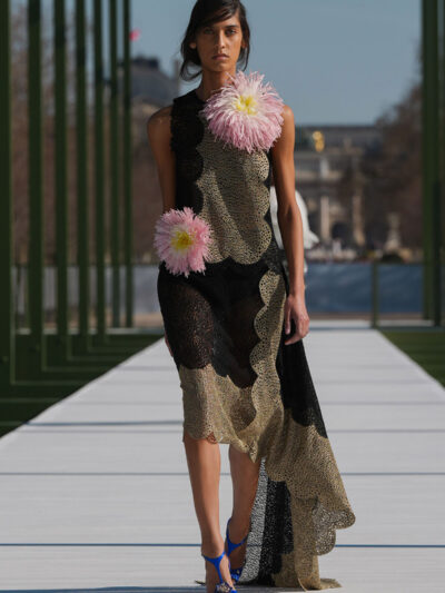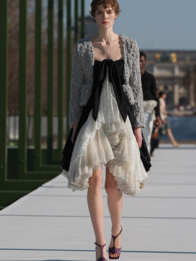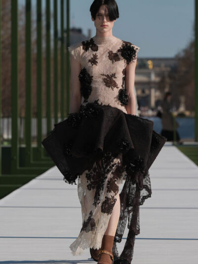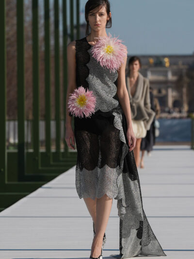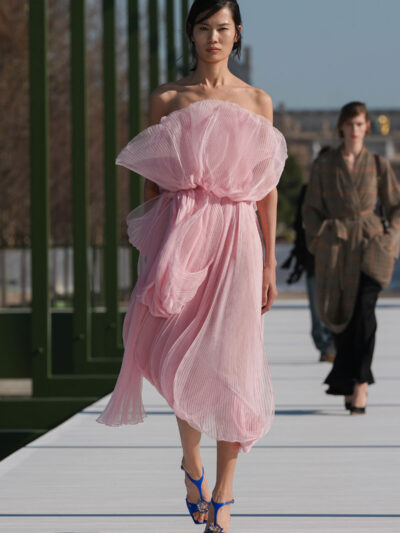 Sau nhiều show diễn được tổ chức trong nhà, Dior Thu Đông 2026 đã di chuyển ra không gian ngoài trời của Jardin des Tuileries. Nếu khách quan đã quen với hình ảnh không gian bên trong thì nay, họ trầm trồ khi thấy Dior dựng một sàn diễn bắc ngang hồ bát giác, được trang trí với những bông súng sặc sỡ cùng lá to bản.