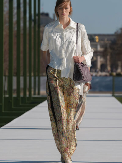 Một cuộc dạo chơi trong công viên không thể thiếu những chiếc túi đi kèm. Xuất hiện một mẫu túi trông khá giống với túi đựng hộp cơm phù hợp để đi picnic, tất nhiên là làm từ da thuộc và chần bông họa tiết cannage trứ danh của Dior. Nhiều người mẫu đeo túi tote hoặc túi shopper, và cả túi messenger – tất cả đều có form dáng to bản dễ đựng đồ. Cũng có cả một mẫu clutch trông khá giống với…vỏ hạt lạc, hay là số 8 yêu thích của quý ngài Christian Dior nhỉ?