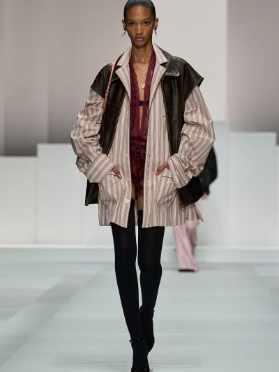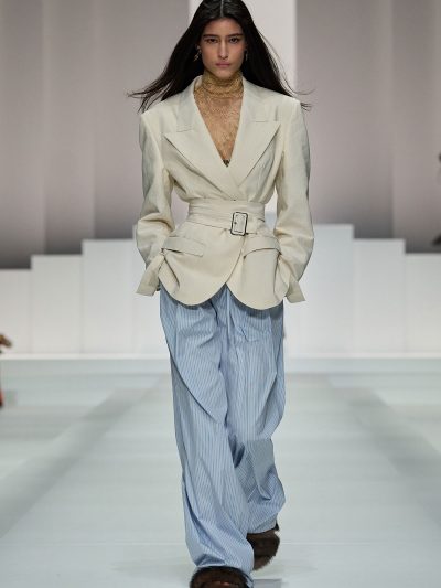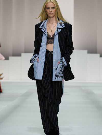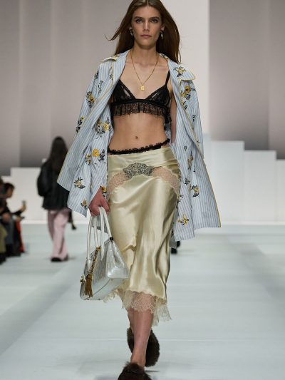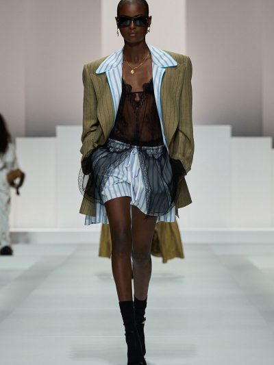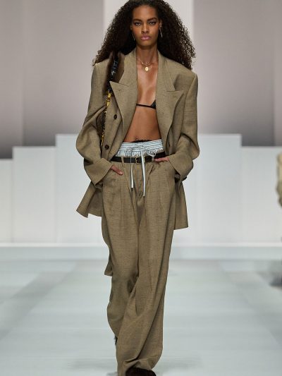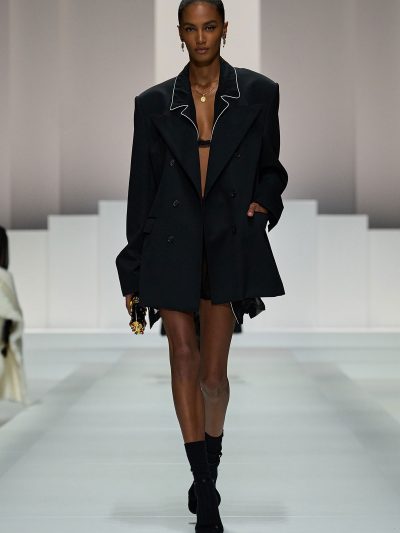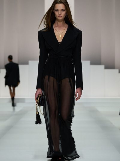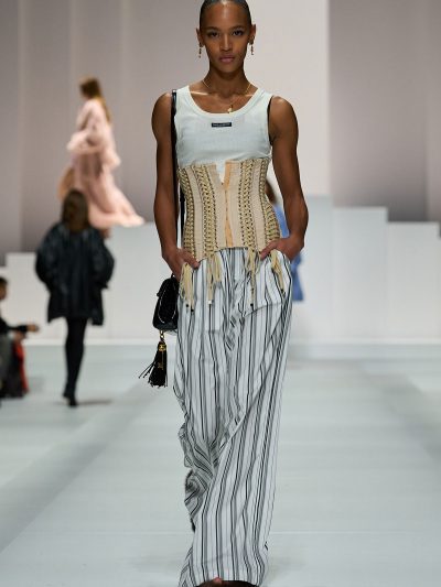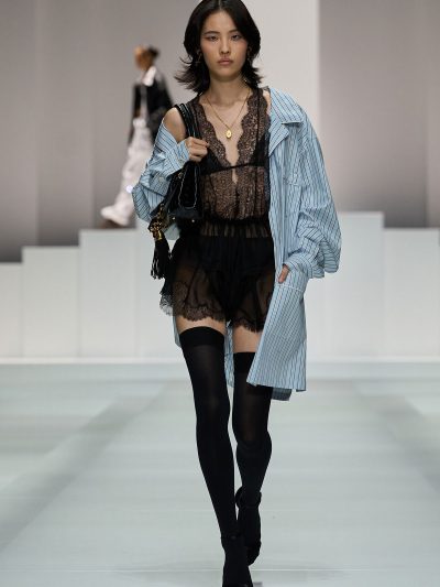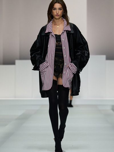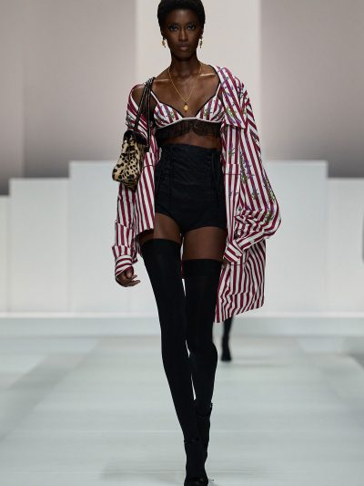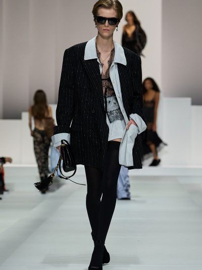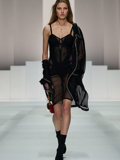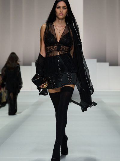 Show Dolce & Gabbana Xuân Hè 2026 còn gợi ý một số cách tận dụng nội y để đi chơi. Mặc bralette hay corset bên trong và choàng vội chiếc áo blazer ra ngoài, chân mang giày cao gót cực sexy, các người mẫu như sẵn sàng đi hẹn hò. Lối phối đồ này tiếp tục ủng hộ cho phong cách diện nội y xuống phố.