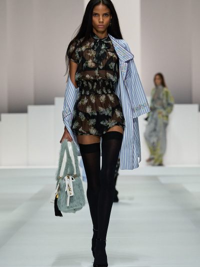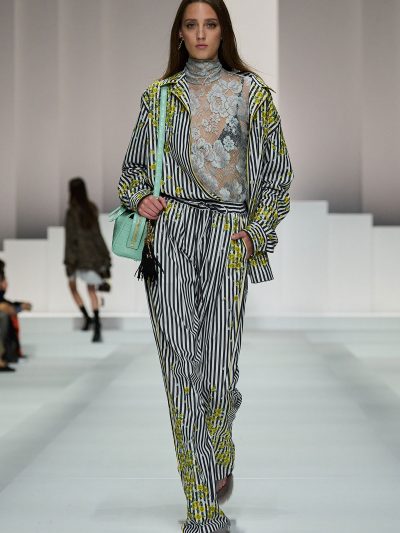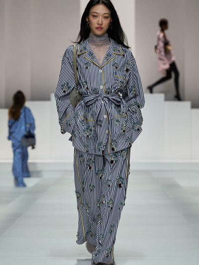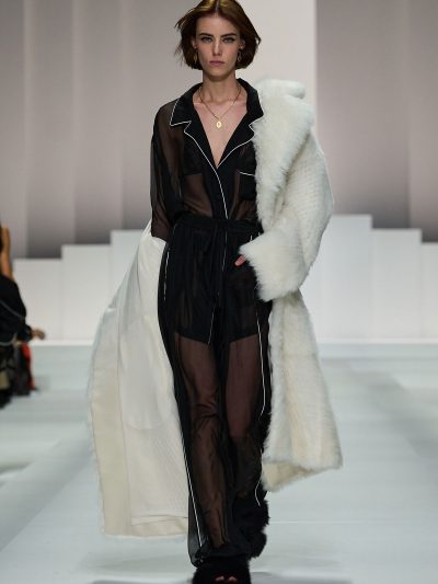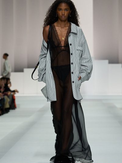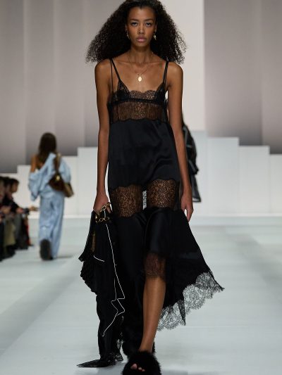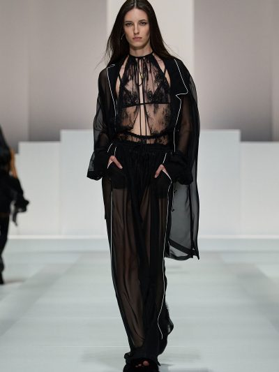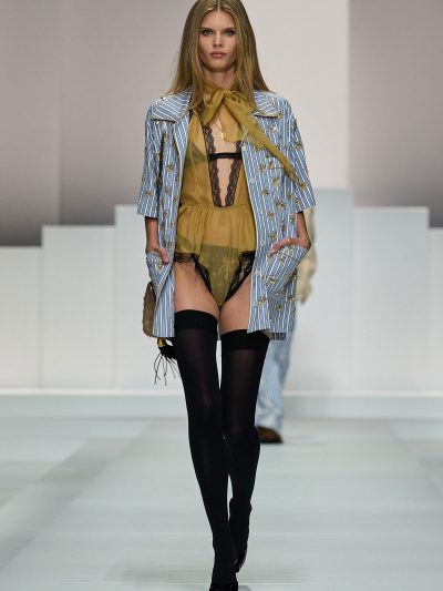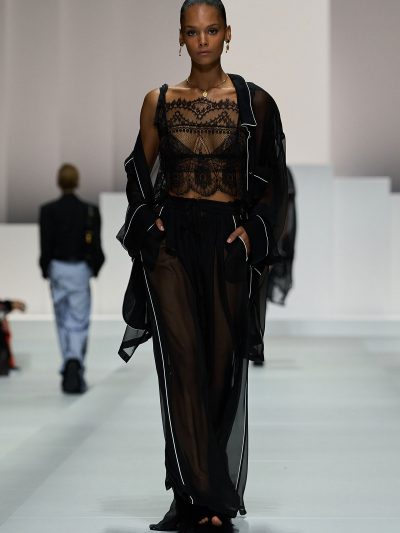 Tất nhiên, đồ ngủ của Dolce & Gabbana không tầm thường. Trên nền chất liệu vải cotton mềm mỏng quen thuộc của pyjama, thương hiệu đã đính kết vô vàn pha lê lấp lánh, và phối chúng cùng nội y bằng ren mỏng tang. Các loại babydoll và quần vớ khiến các người mẫu như thể vừa bước ra từ chốn boudoir riêng tư của họ.