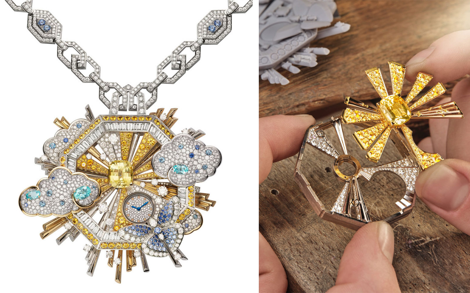 Mẫu đồng hồ dây chuyền Nuvole Preziose như một tác phẩm điêu khắc tôn vinh kiến trúc La Mã, gợi nhớ đến trần bát giác của thánh đường Basilica Maxentius. Mặt số được nạm một viên sapphire vàng 6,88 carat lấp lánh, được bao quanh bởi những cánh bướm rung rinh và những đám mây. Những chi tiết trang trí này còn có thể được tháo rời để dùng làm khuyên tai.