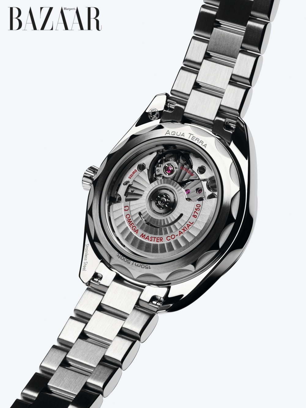 Bộ máy tinh xảo của OMEGA Aqua Terra 30mm qua nắp lưng bằng kính sapphire trong suốt.