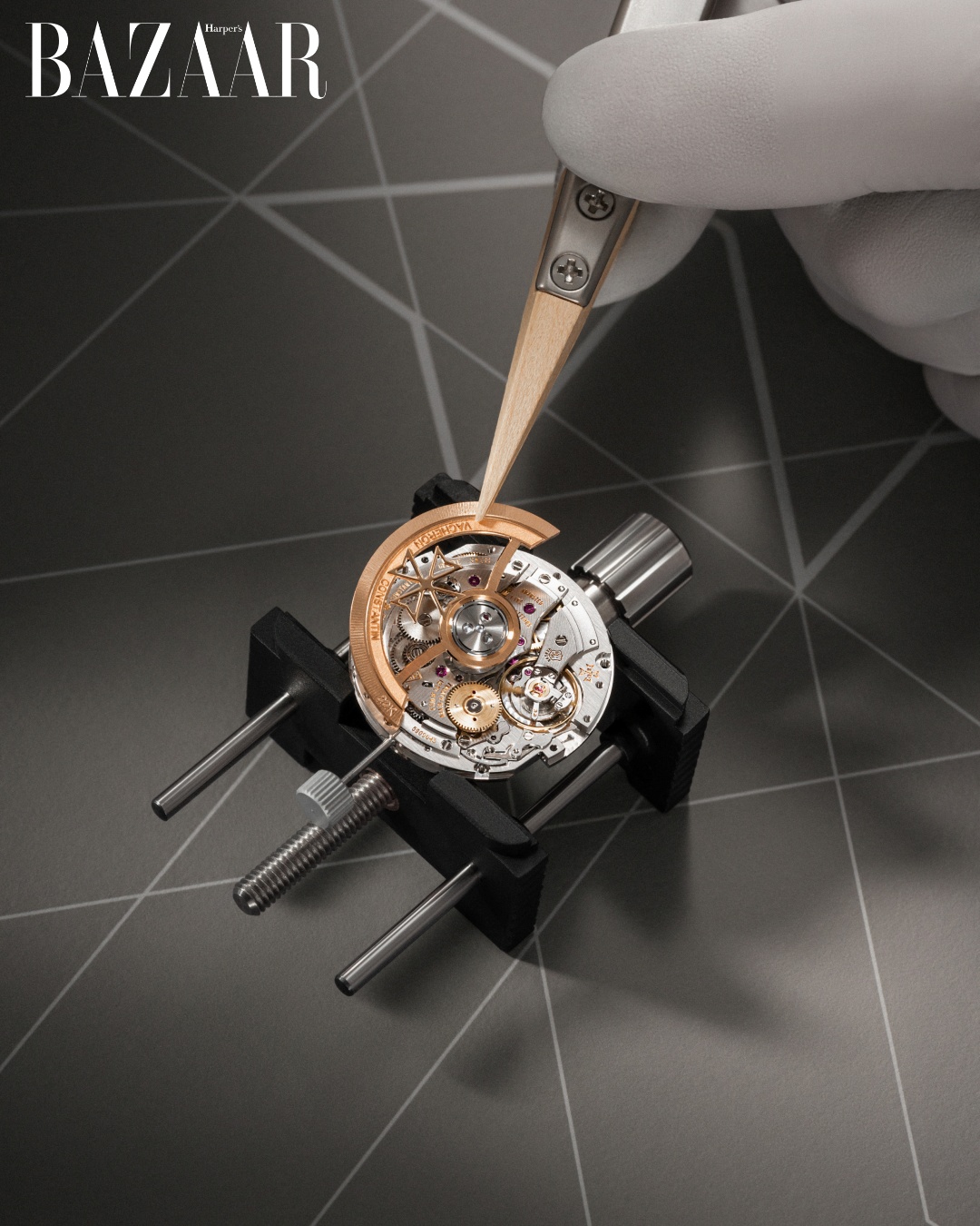 Bộ máy lộ cơ còn mang theo tình yêu của các nghệ nhân chế tác đồng hồ đến từng tiểu tiết nhỏ nhất. Mỗi bộ phận đều được hoàn thiện công phu: vát cạnh, đánh bóng hoặc bo tròn thủ công để tôn lên vẻ đẹp bộ máy. Sự tinh tế này tiếp tục nhấn mạnh ở mặt sau, nơi phô bày phong cách hoàn thiện “côte unique” trên các cầu máy. Đây là kỹ thuật trang trí truyền thống Vacheron Constantin sử dụng hơn một thế kỷ trước, được tái phát hiện vào năm 2021 và chế tác lại trên Historiques American 1921.
